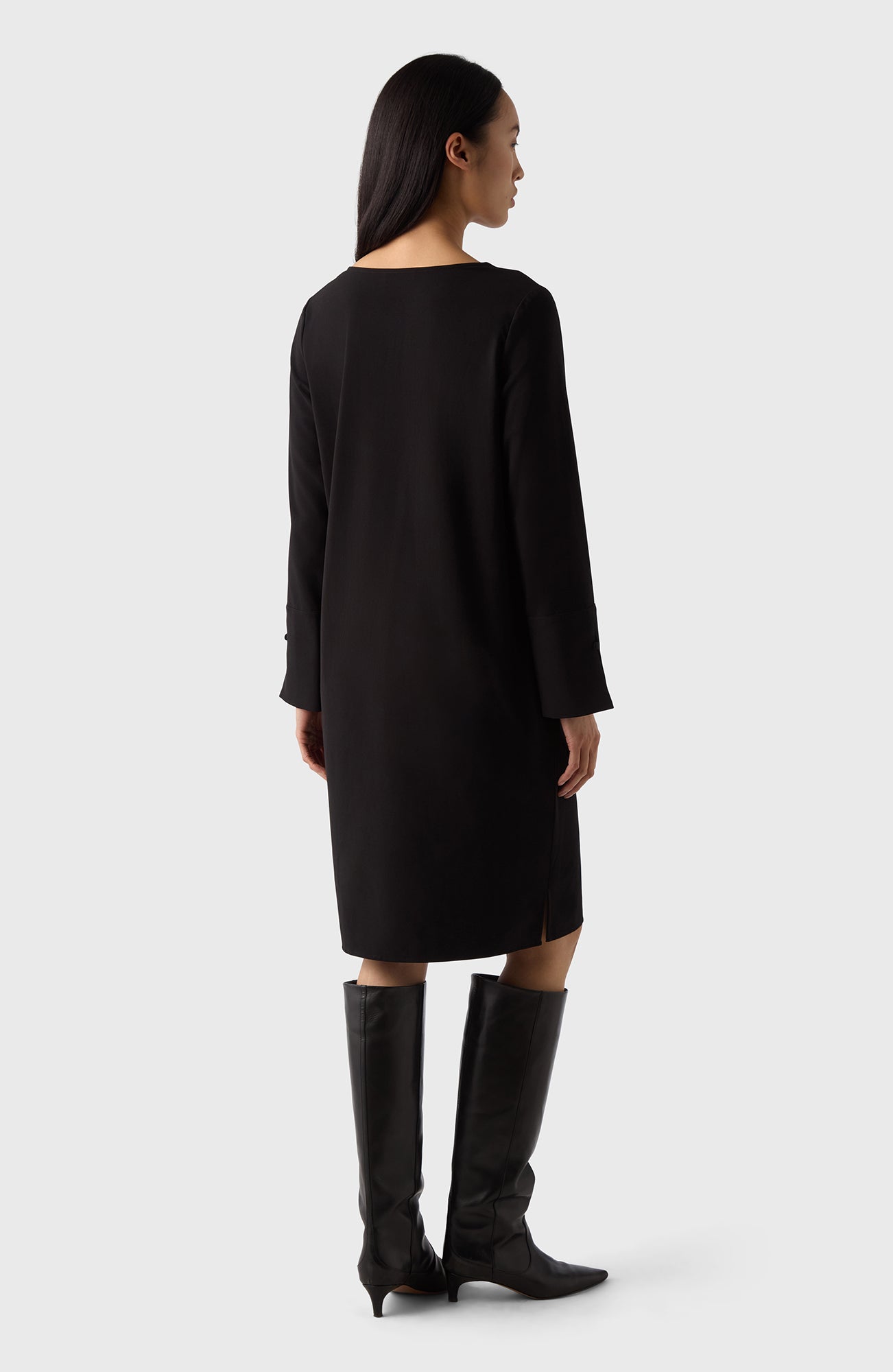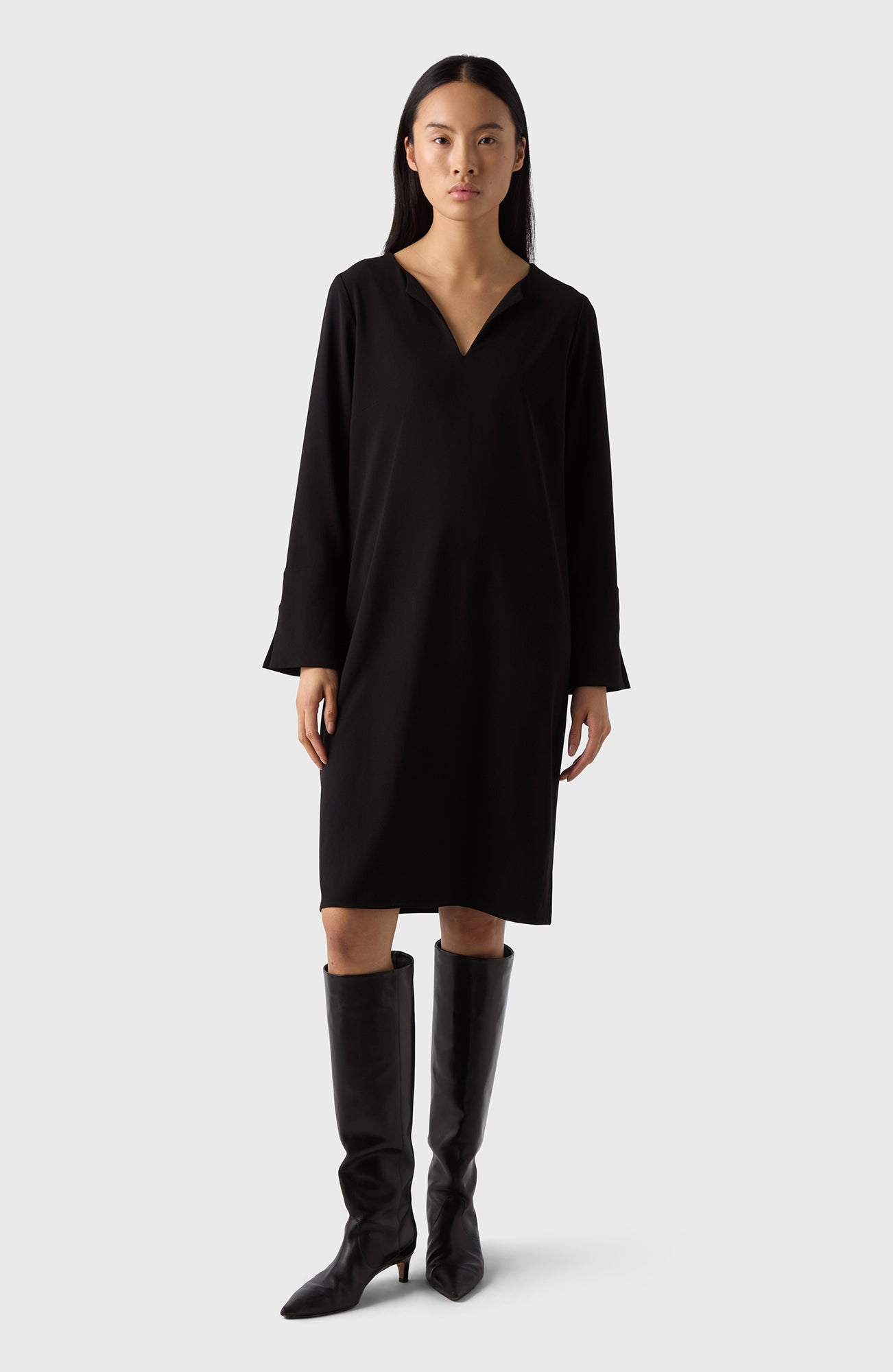 Semi-V-necked dress with long sleeves with large cuffs and fabric-covered buttons. Efva is the perfect everyday dress, suitable for all occasions. Wear as it is or wrap yourself up with the belt for a feminine silhouette.