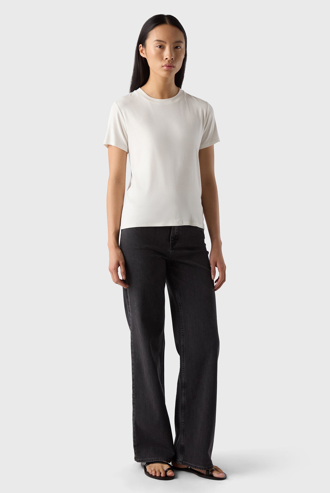 - Slim fit with flared leg