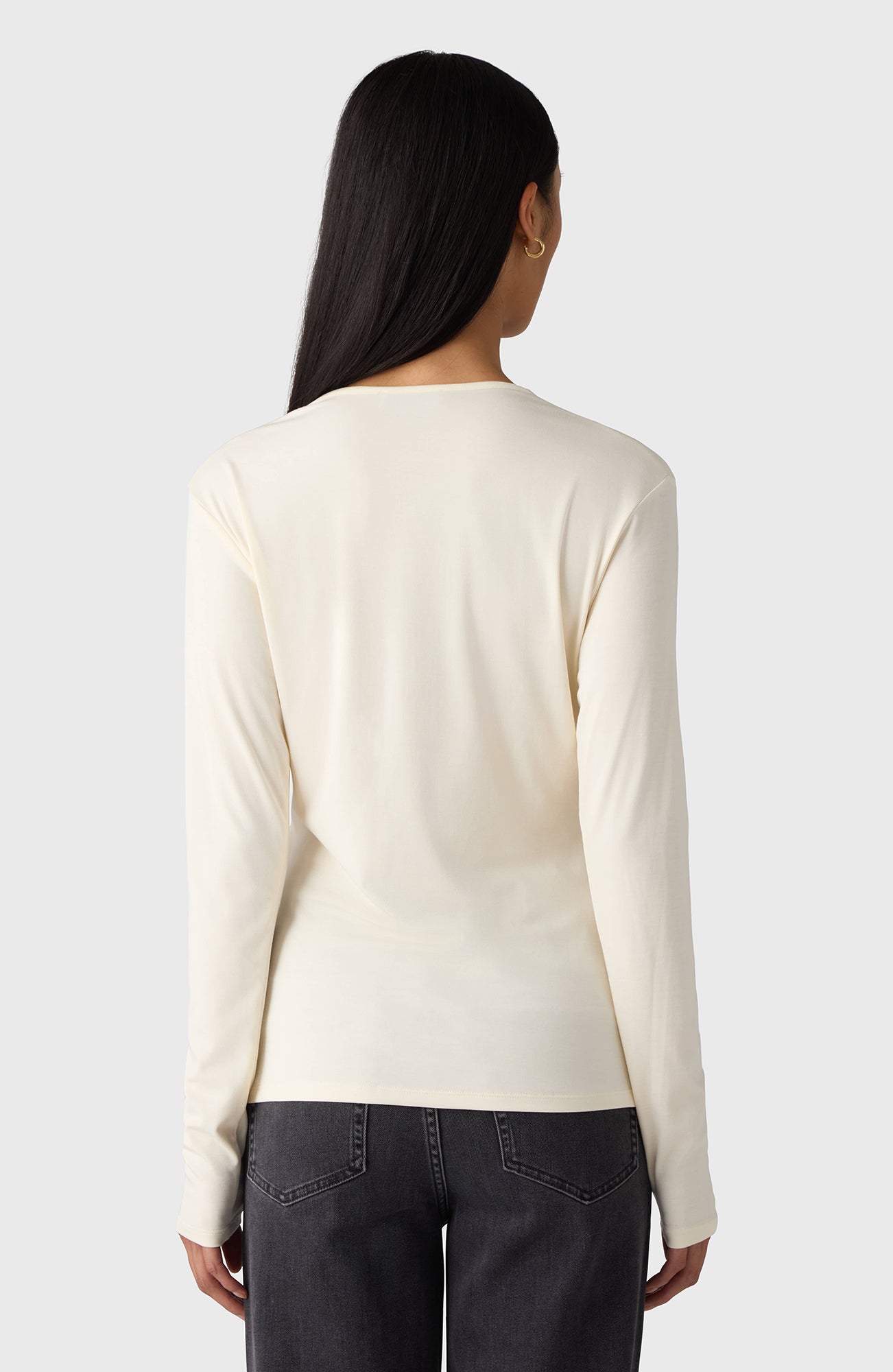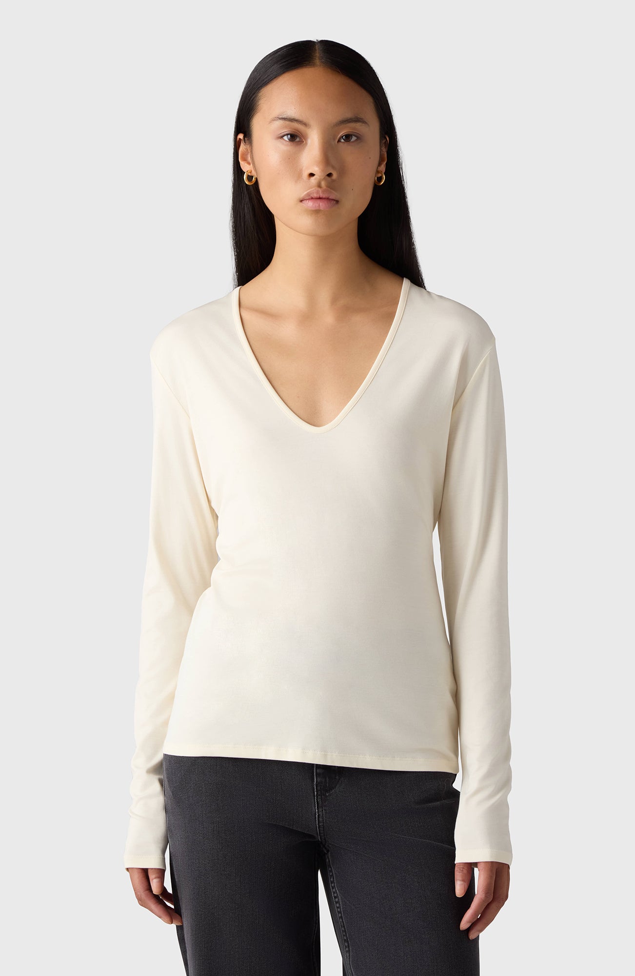 The Dannie Top features a tight fit, crafted in the softest modal. It is designed with a soft V-neck and long sleeves, perfect for tucking into high-waisted trousers for a minimalist look.