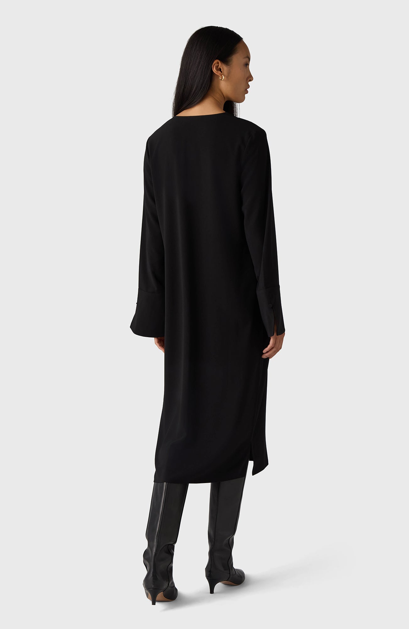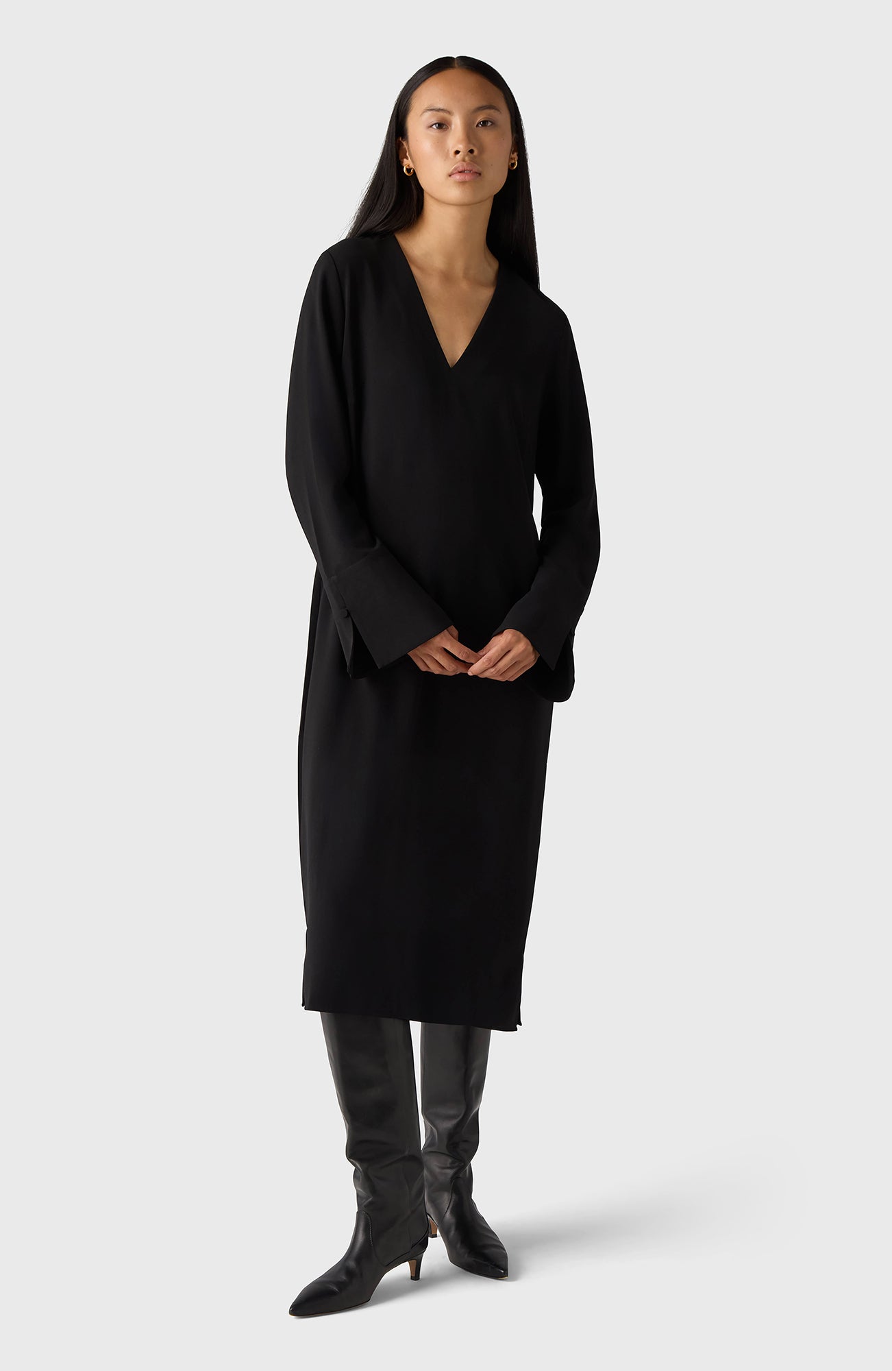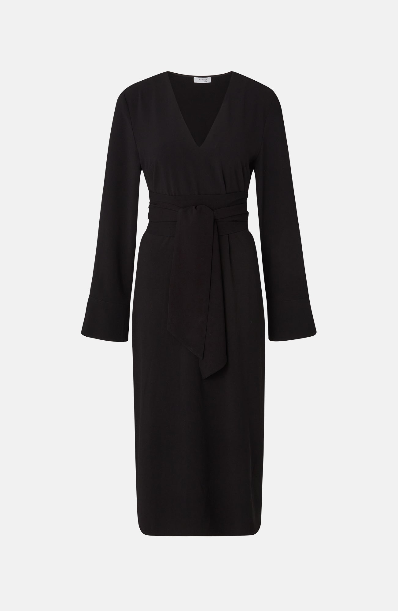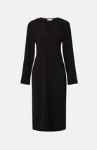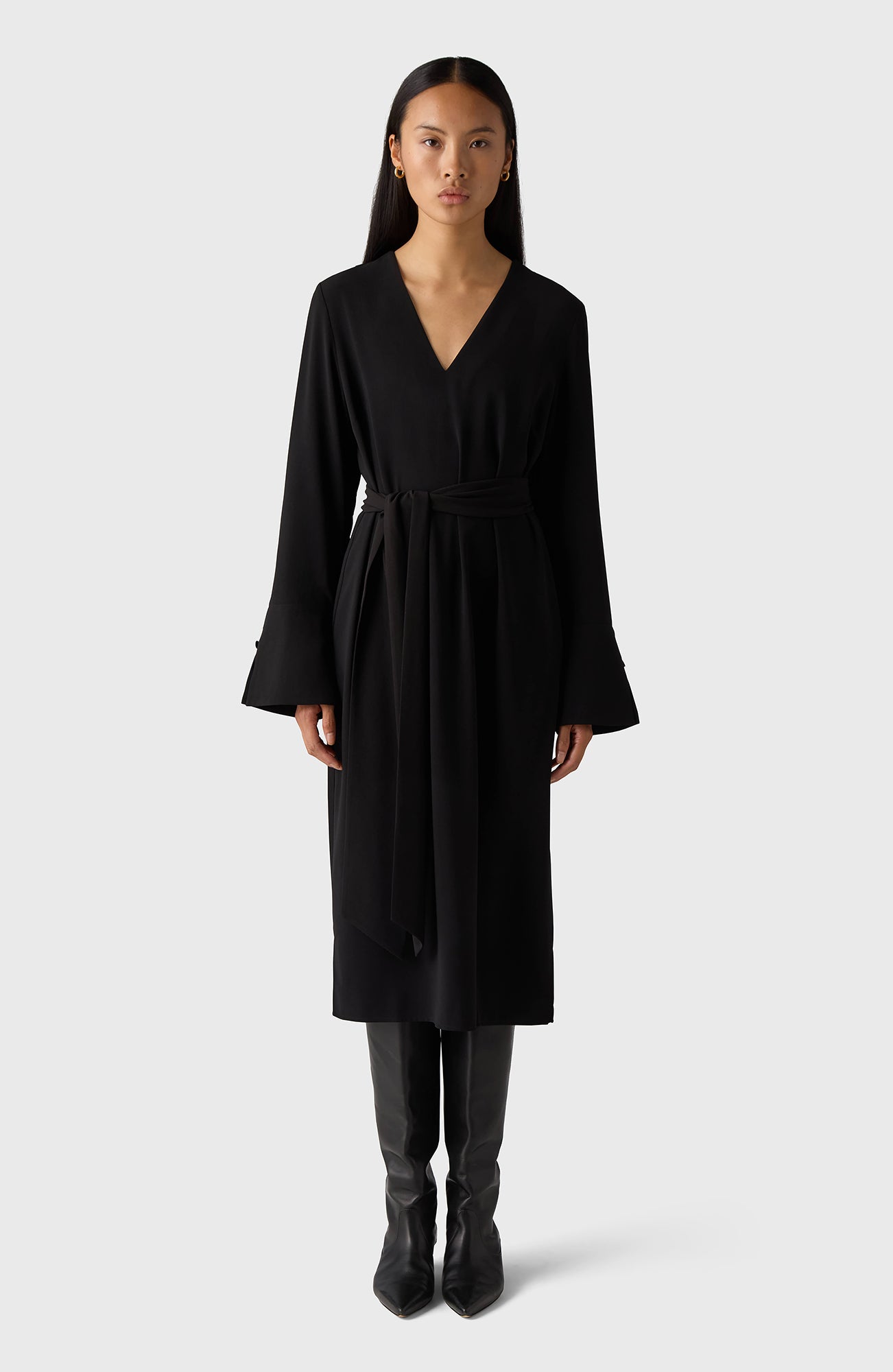 The Kate Dress is a V-necked midi dress that features long sleeves with cuffs and comes complete with an accompanying belt to enhance your silhouette.