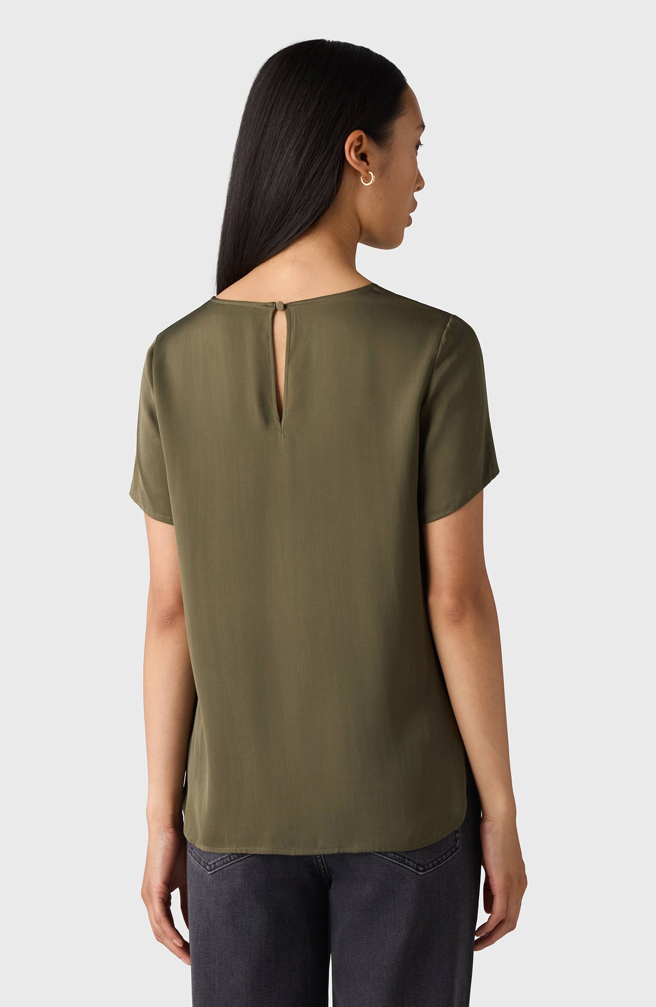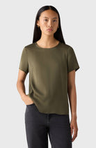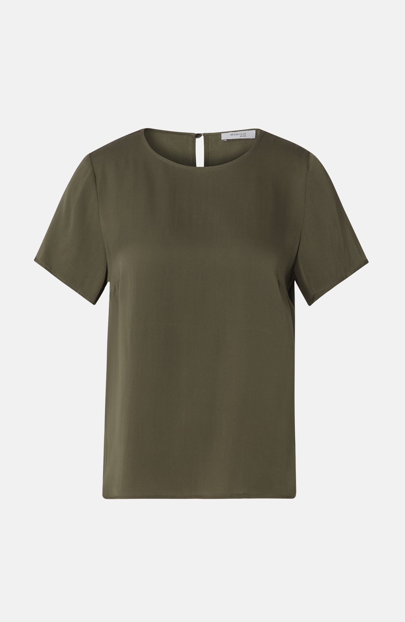 The Lorna Top is a round-necked, short-sleeved T-shirt with a neck detail, made from stretch silk. Wear on its own or under a blazer with trousers or your favourite denim.