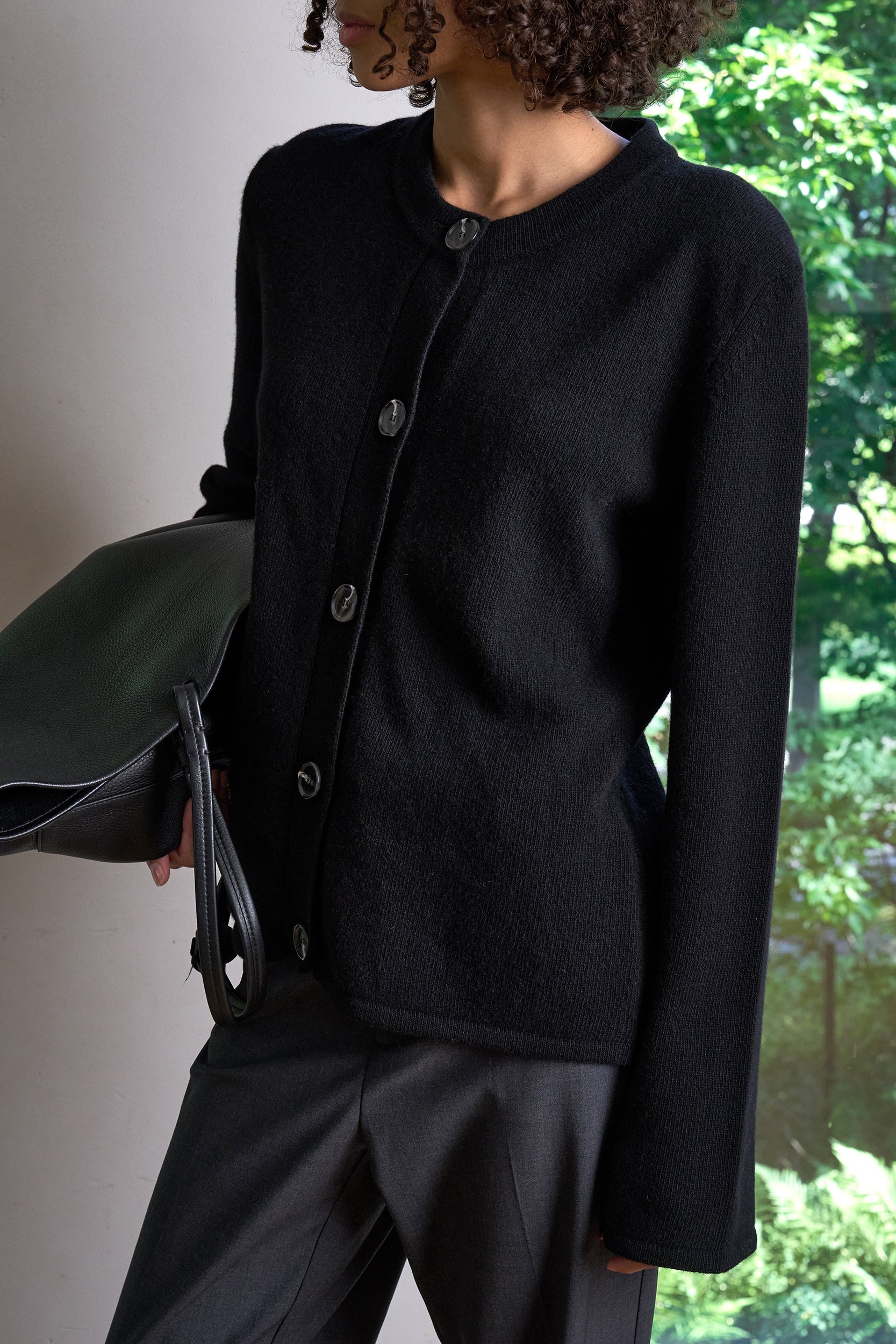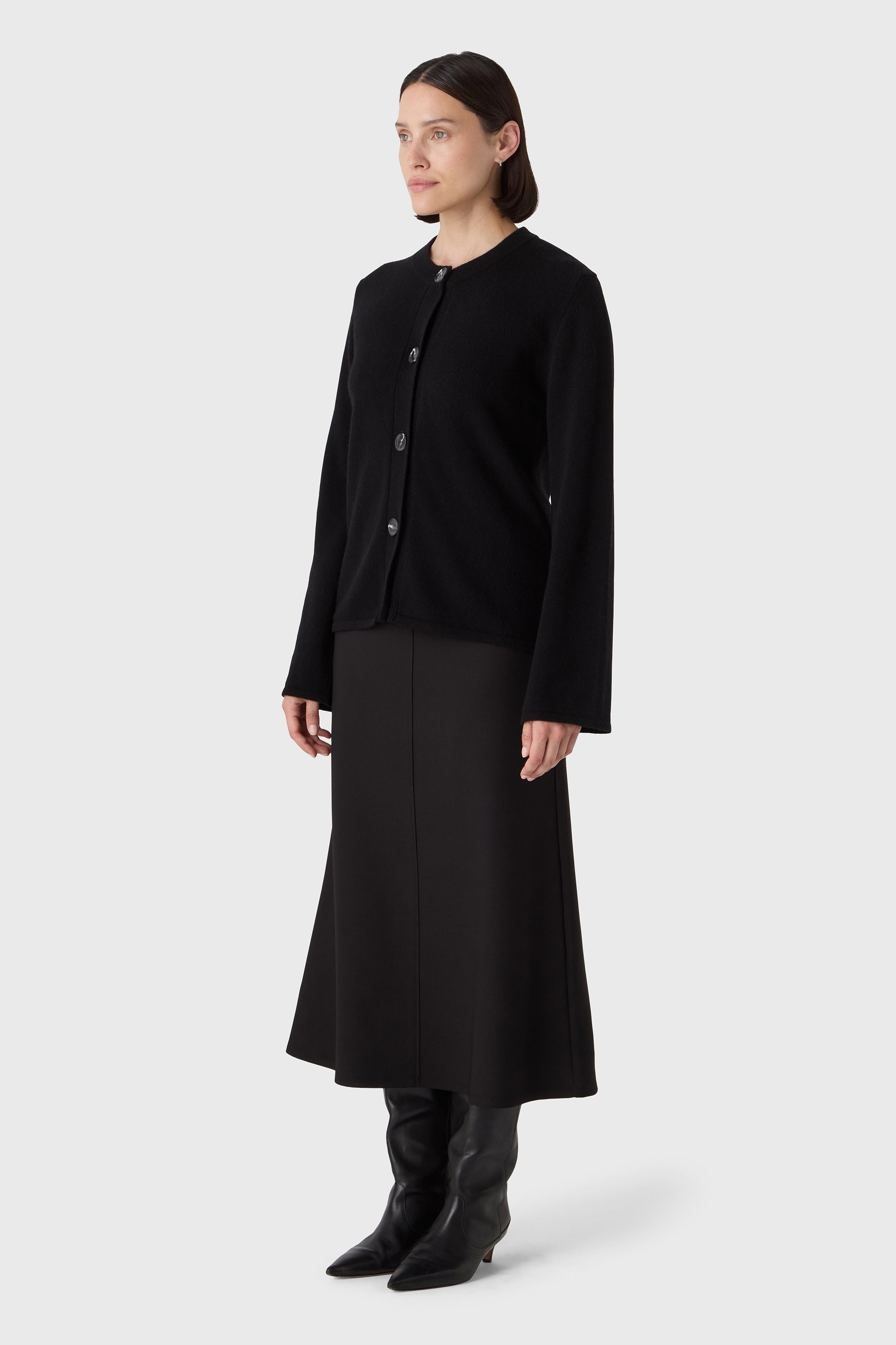 A clean, sculptural knit. The Elise Cardigan is made from 100% soft wool and shaped with a round neckline, wide sleeves and tonal horn buttons. Easy to wear with trousers, denim or a soft skirt — at work or off duty.