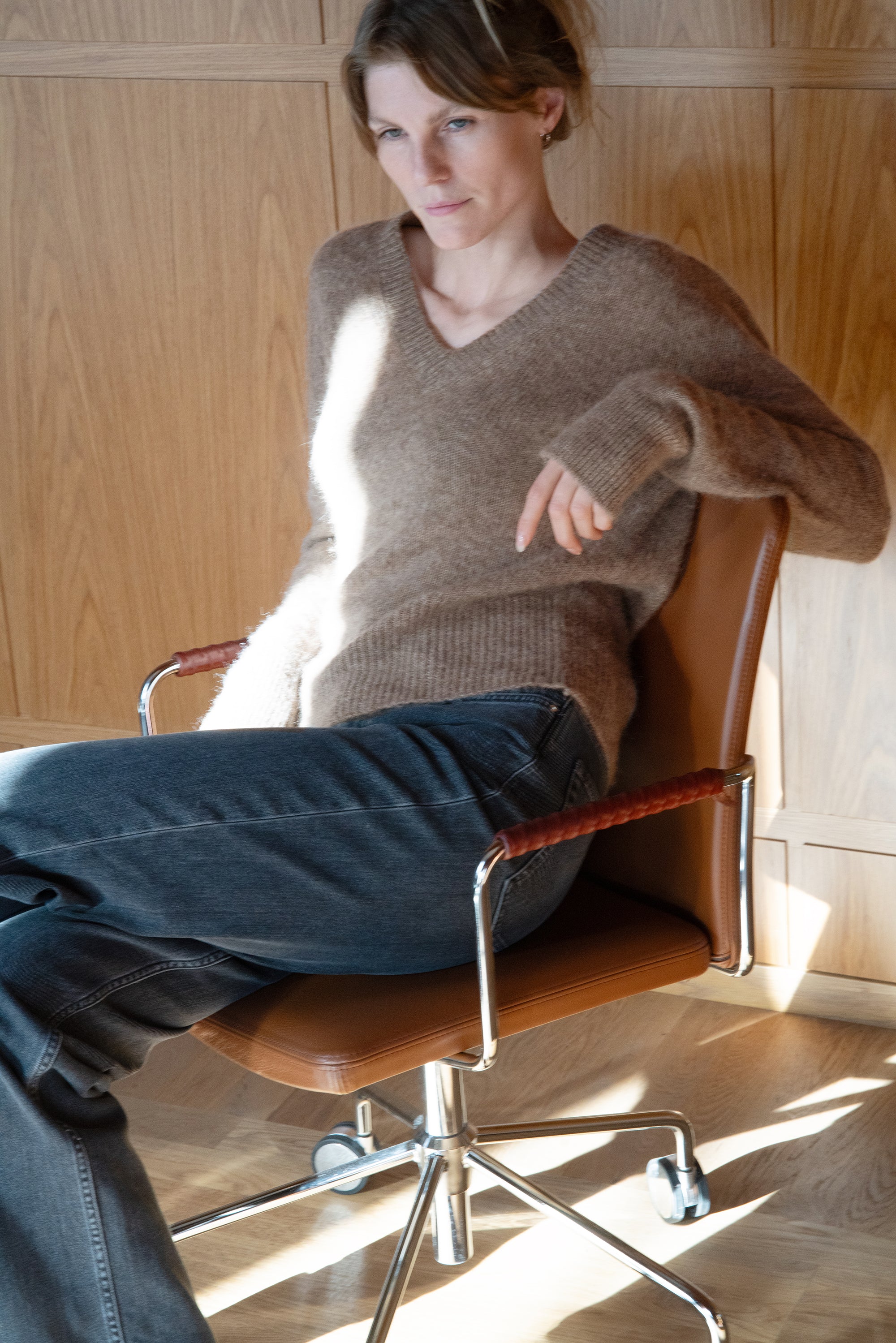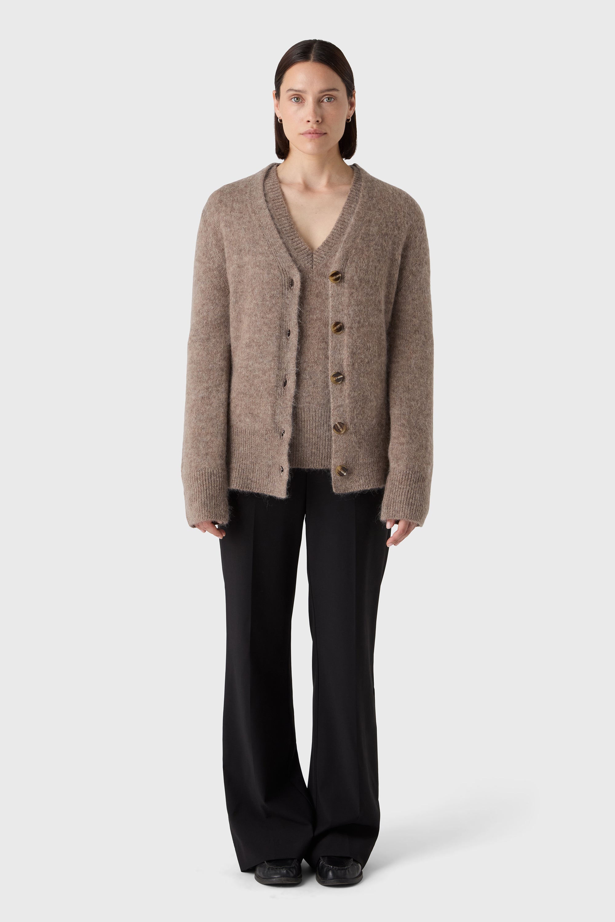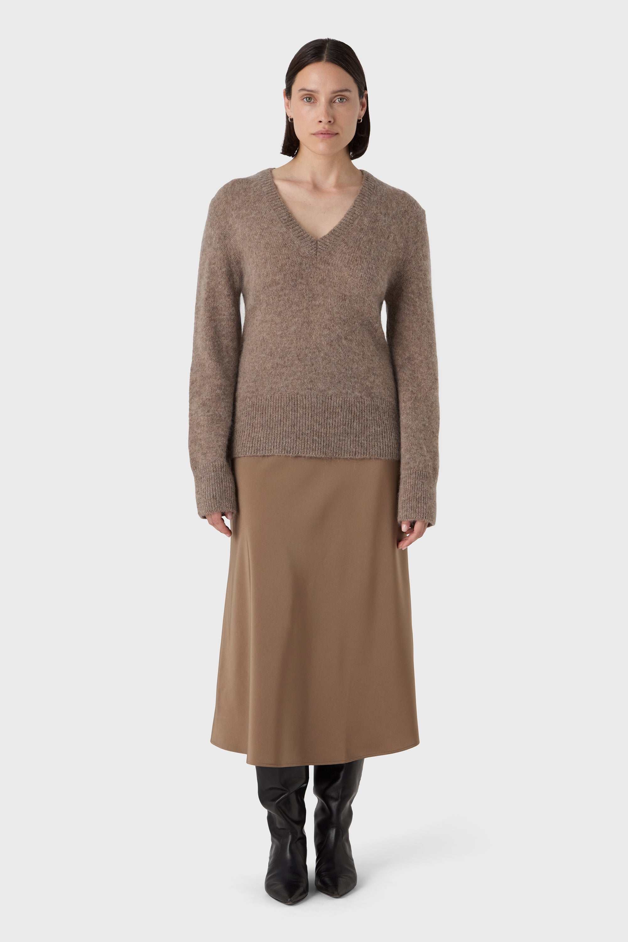 Soft structure, subtle volume. The Giulia Alpaca Jumper is knitted from supersoft alpaca yarn with a lightly brushed texture, dropped shoulders and a flattering V neckline. A warm yet airy favourite — perfect for layering or wearing on its own.
