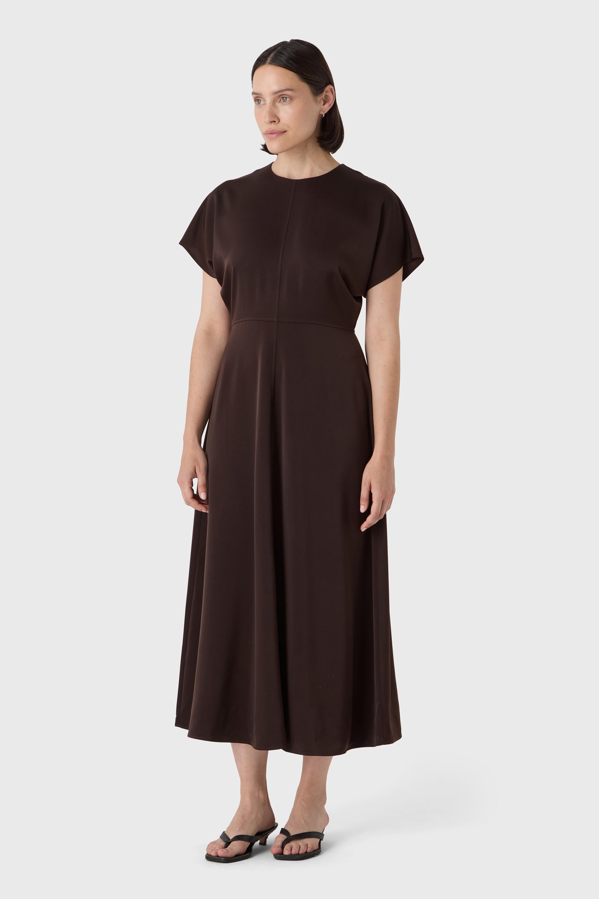 Designed to move with ease and elegance. The Rhonda Dress features a soft round neckline, short sleeves and a flowing, flared skirt. The front seams sculpt the silhouette and add a tailored feel to the otherwise fluid design. Made from satin stretch for comfort and polish from day to night. The dress falls to ankle length.