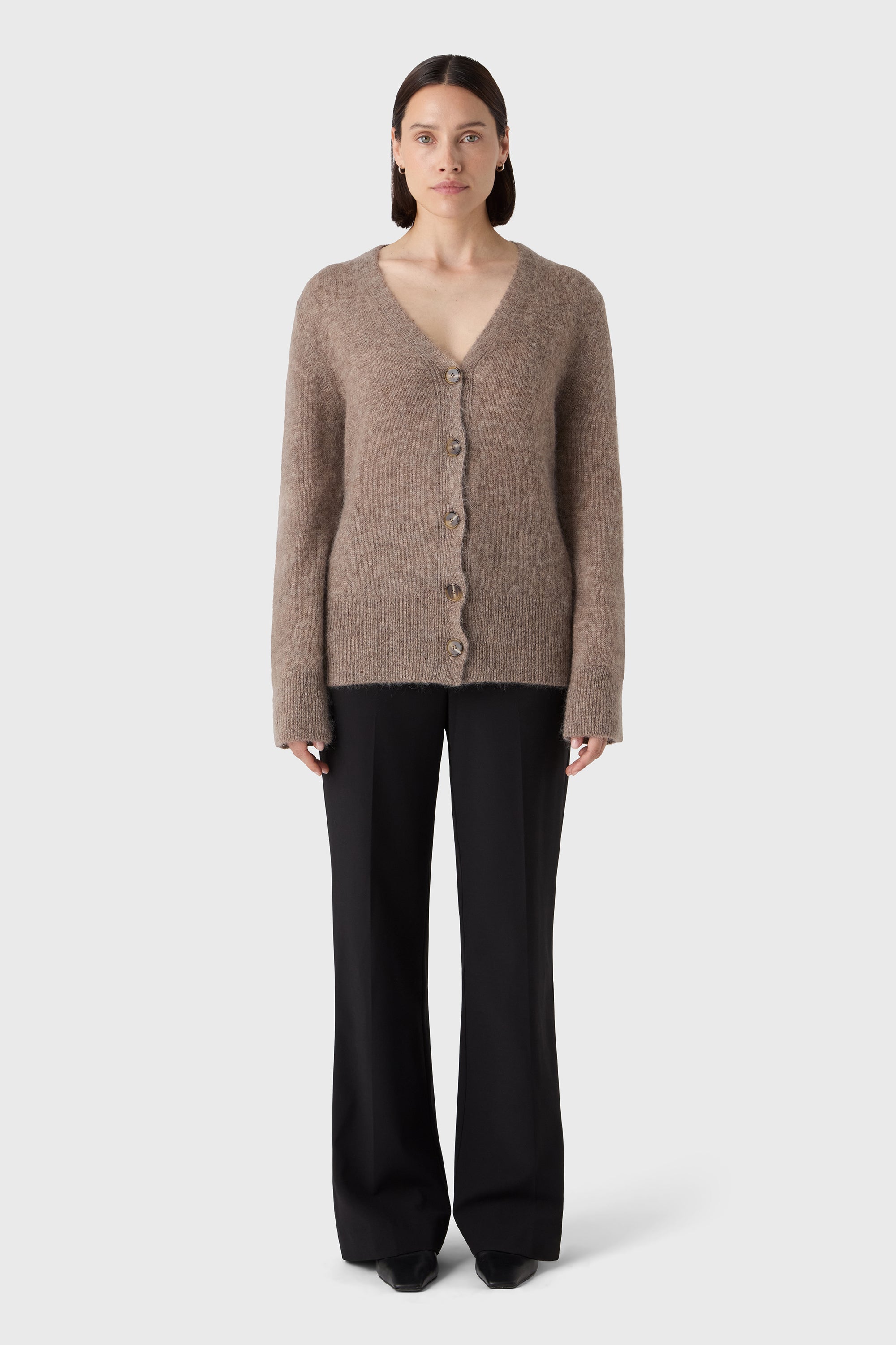 Soft warmth with laid-back elegance. The Zaira Alpaca Cardigan is knitted from supersoft alpaca with a fluffy texture, deep V neckline and tonal buttons. A versatile layer to throw over a shirt, T-shirt or dress — effortless and timeless.