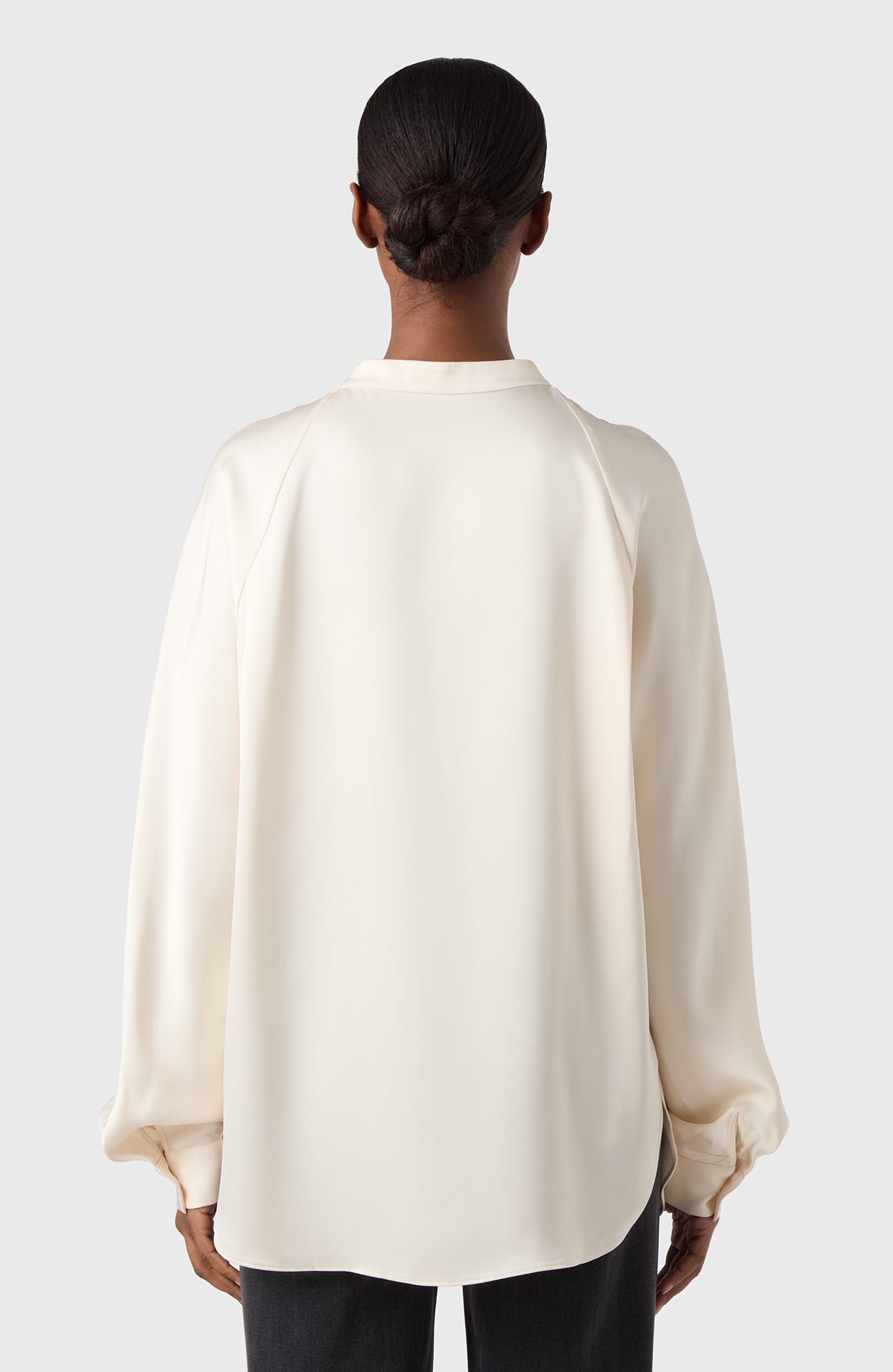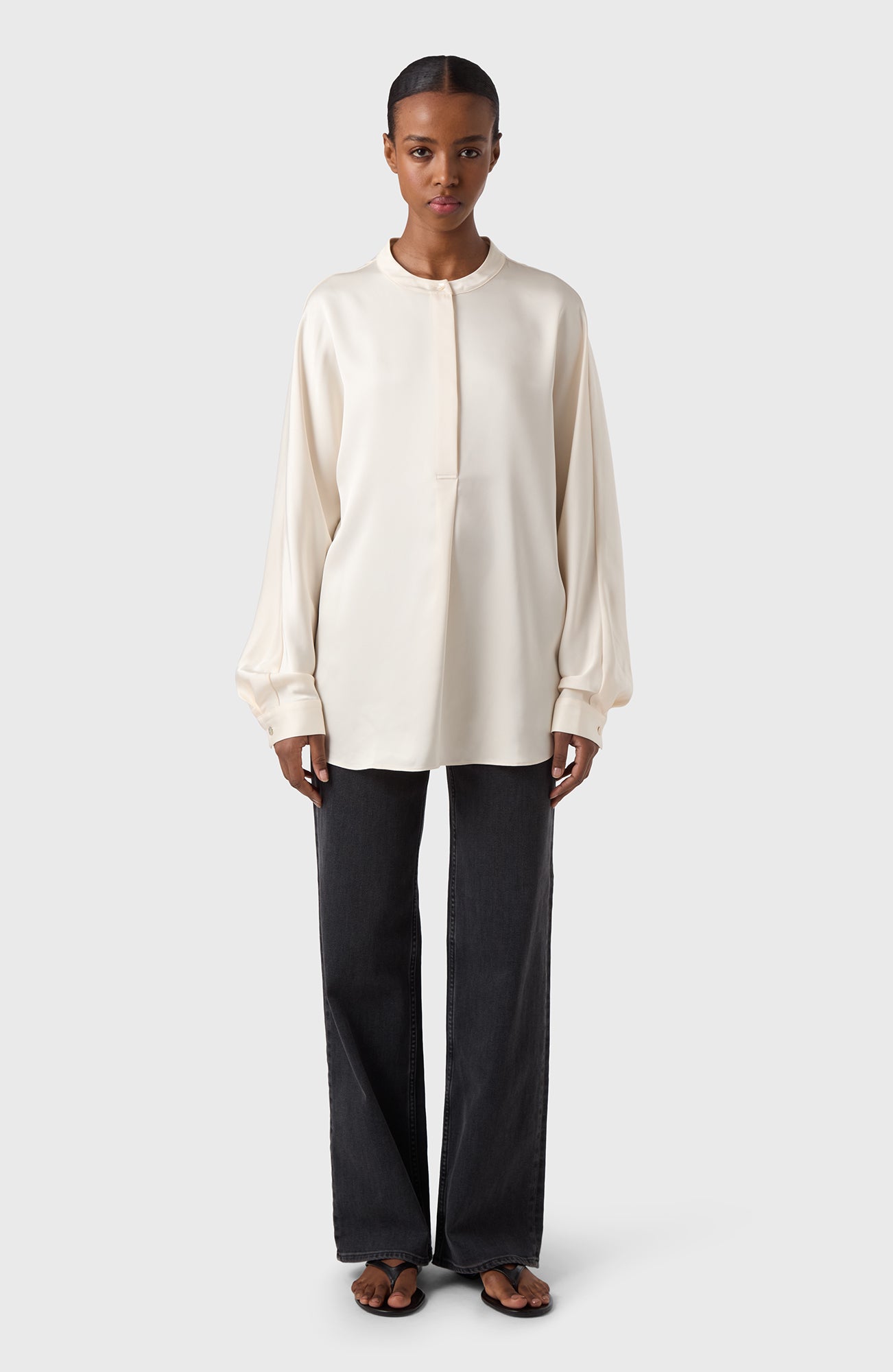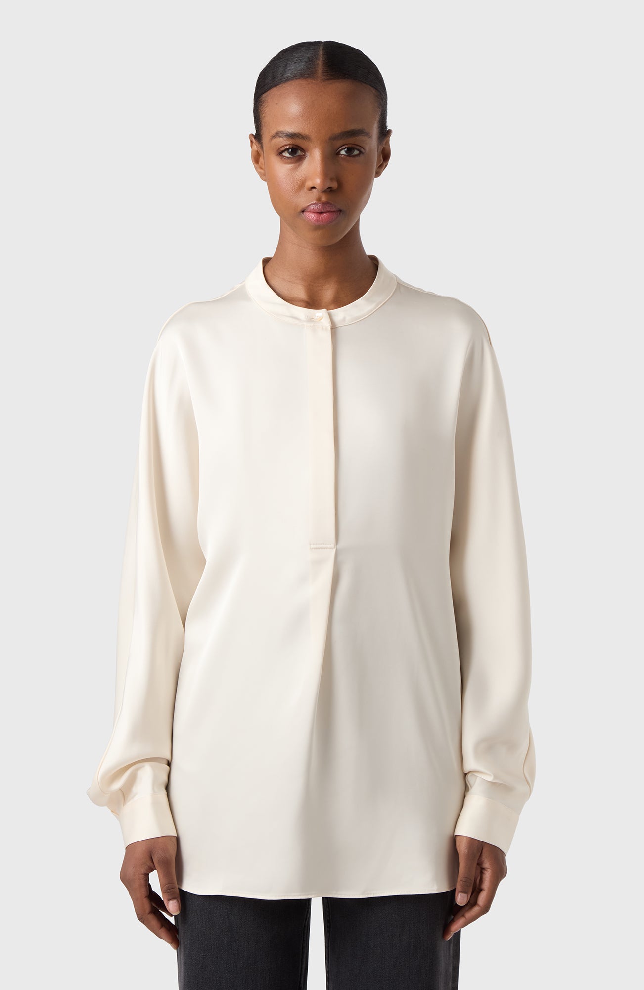 Long-sleeved blouse in soft satin stretch, featuring a round neckline, mother-of-pearl buttons, and gently rounded side hems. Designed with a feminine silhouette that flatters and feels effortless.