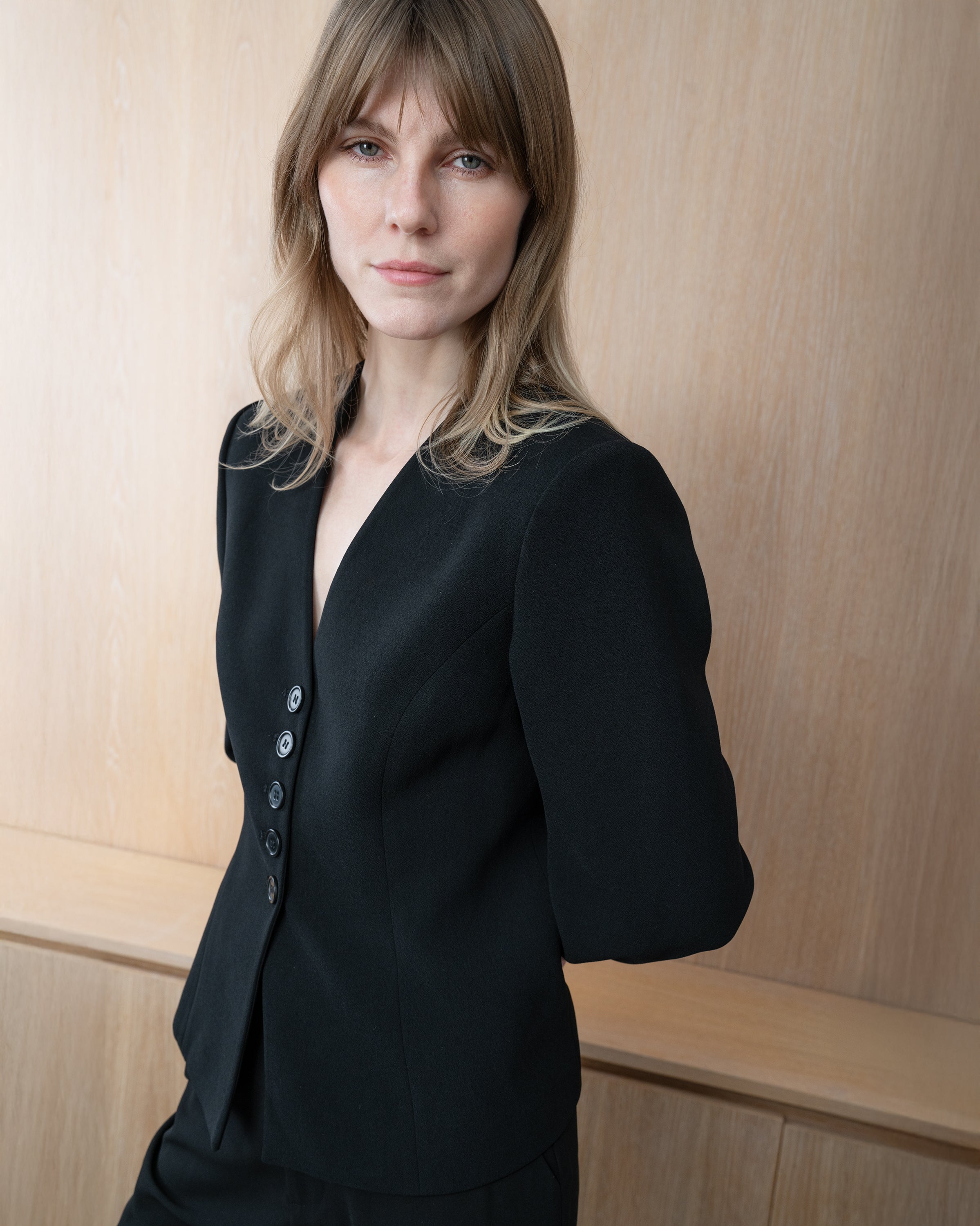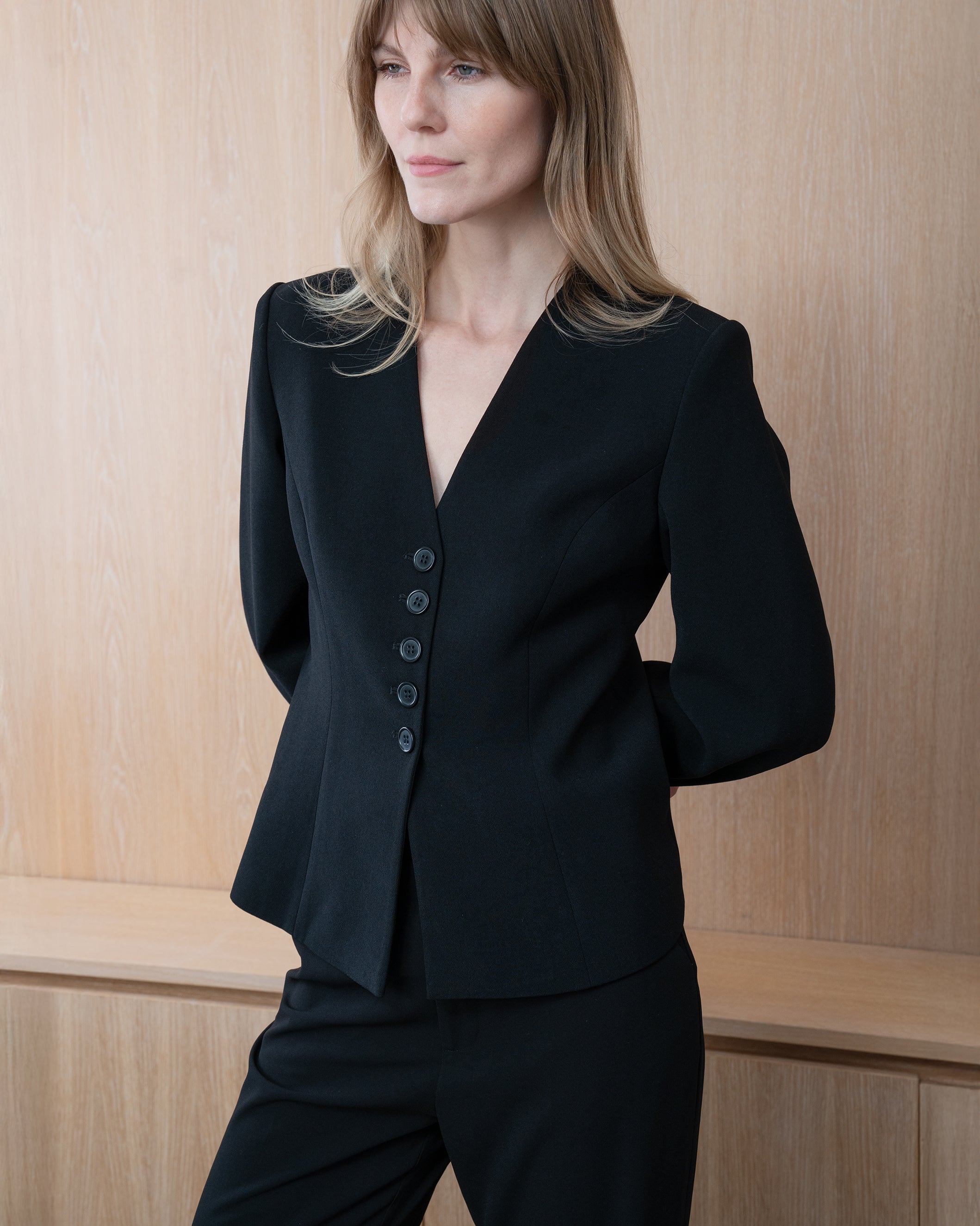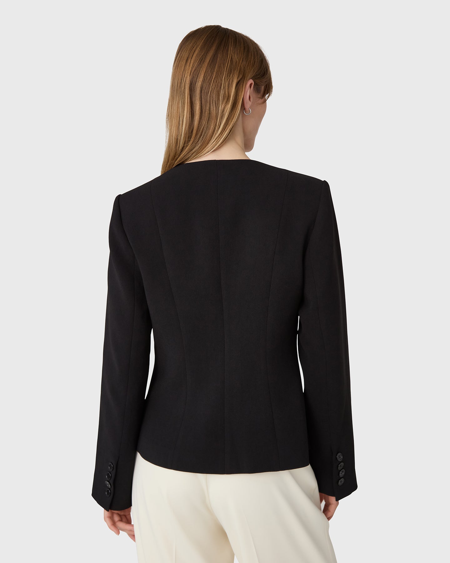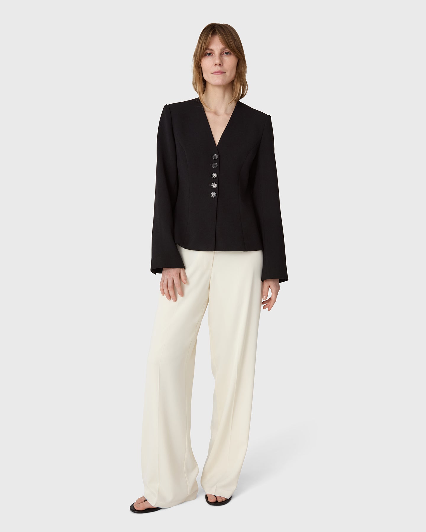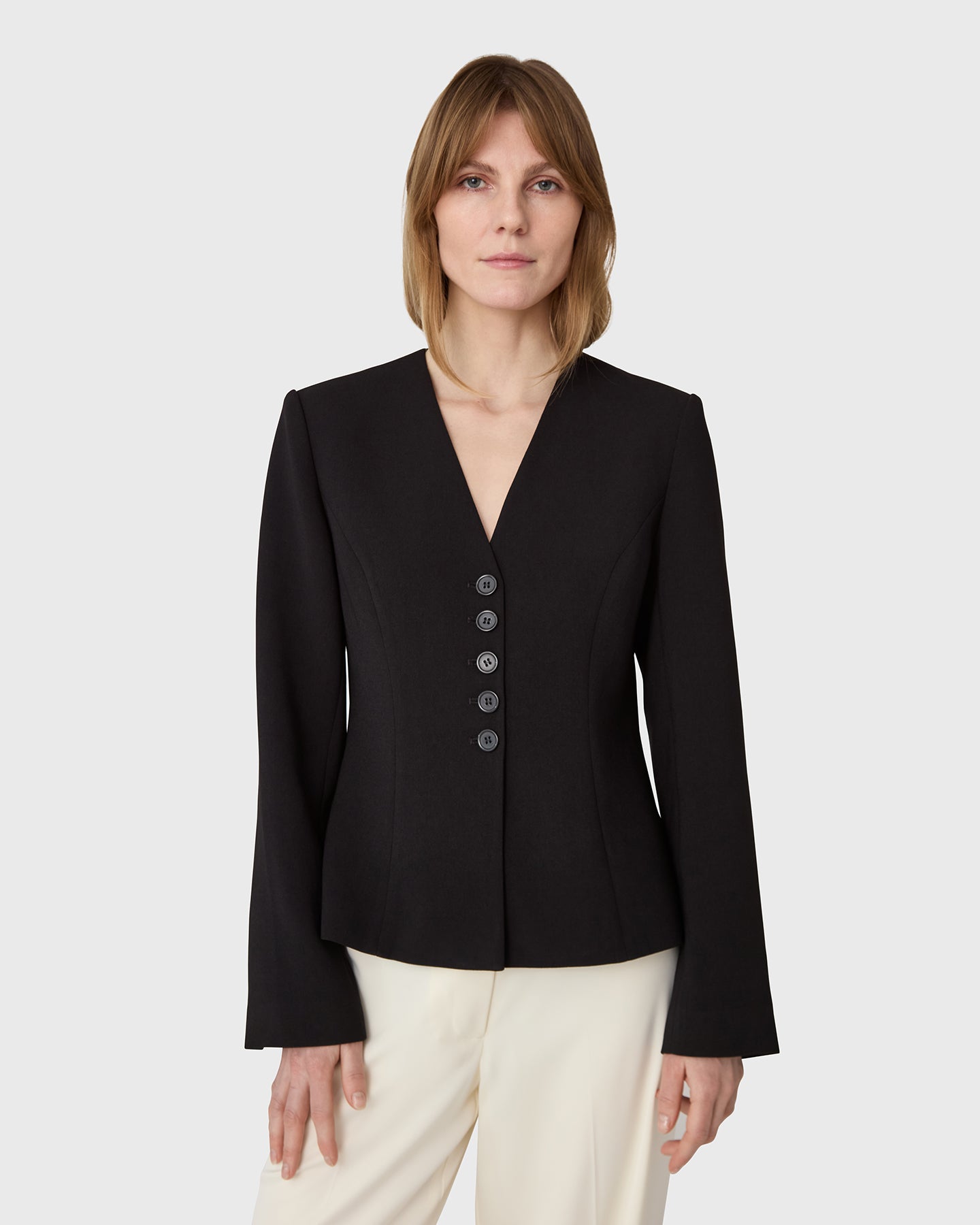 The Dania Crepe Blazer is a V-neck blazer cut in Soft Stretch Crêpe, featuring decorative buttons and a shaped waist that create a refined silhouette. Pair with tailored trousers for a more polished expression, or with denim for a relaxed feel, moving effortlessly from desk to dinner.