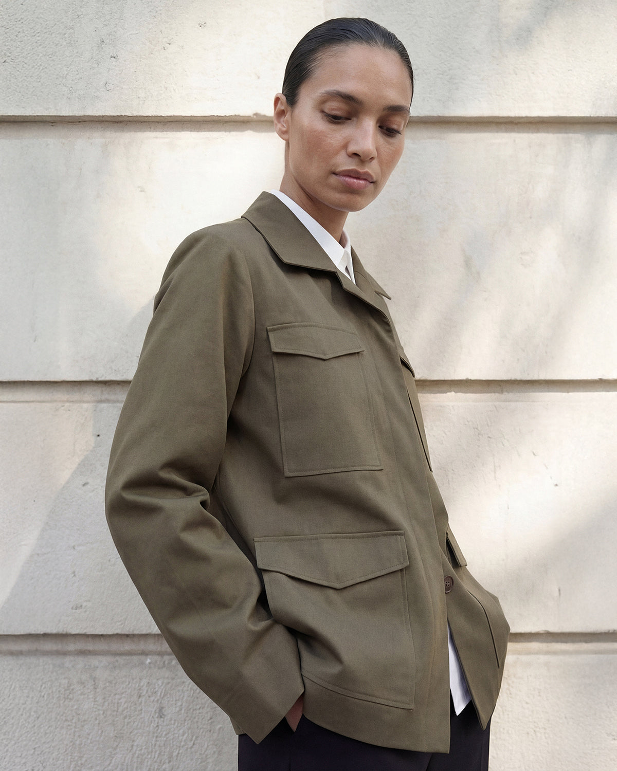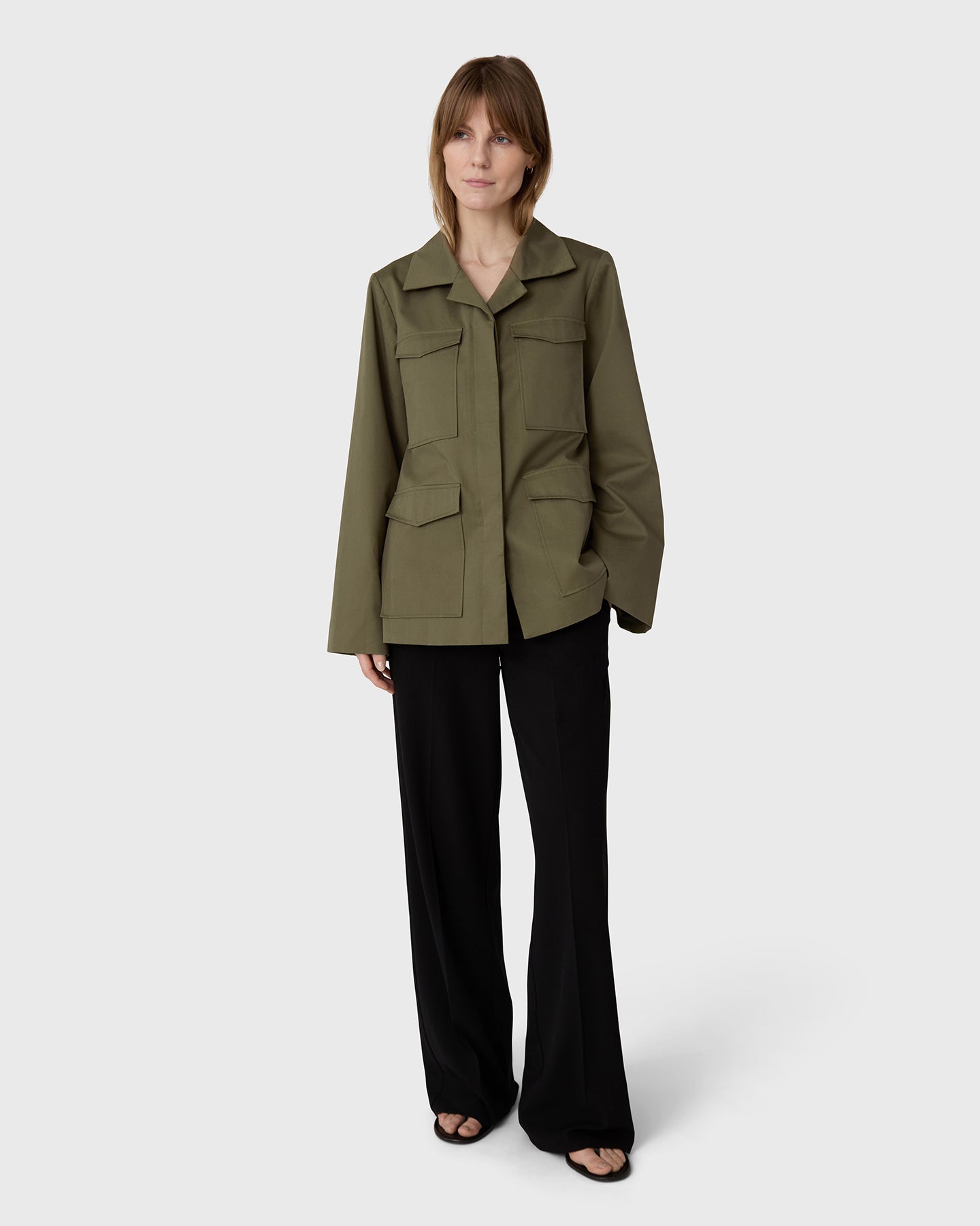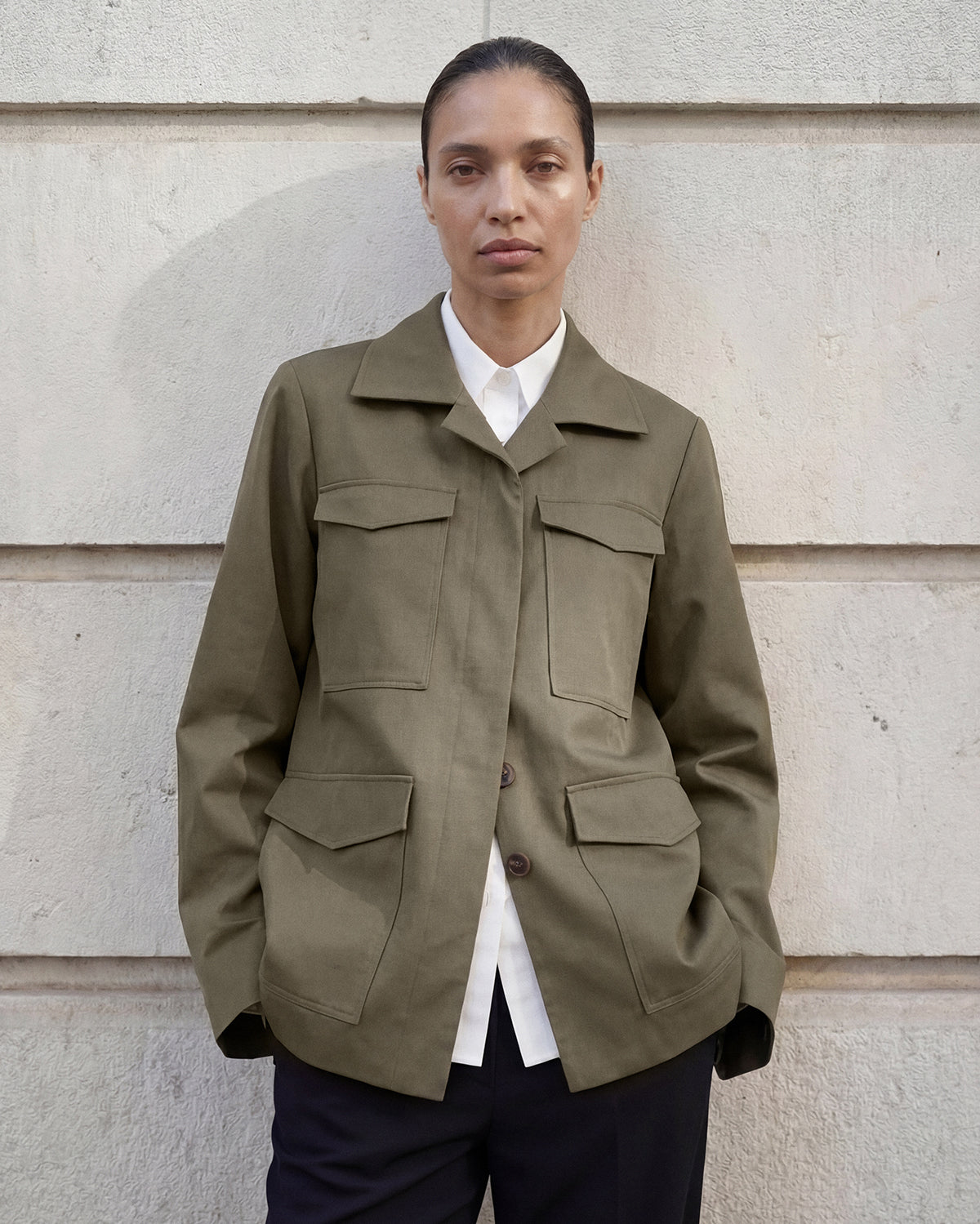 The Riley Cotton Army Jacket is crafted from soft, durable cotton, offering a fitted, slightly longer design with wider sleeves and a clean silhouette. Balancing structure and ease, it is a refined outer layer designed to move effortlessly through your day.