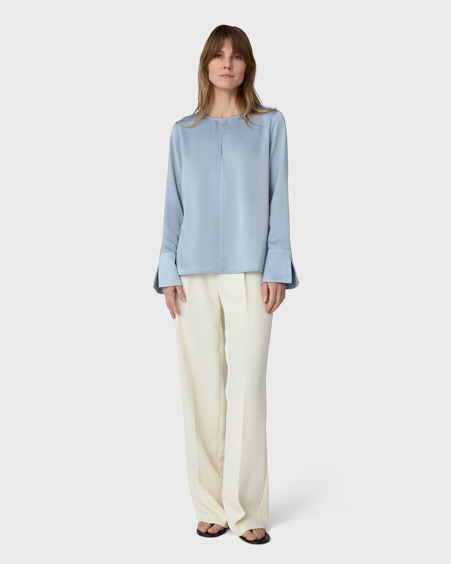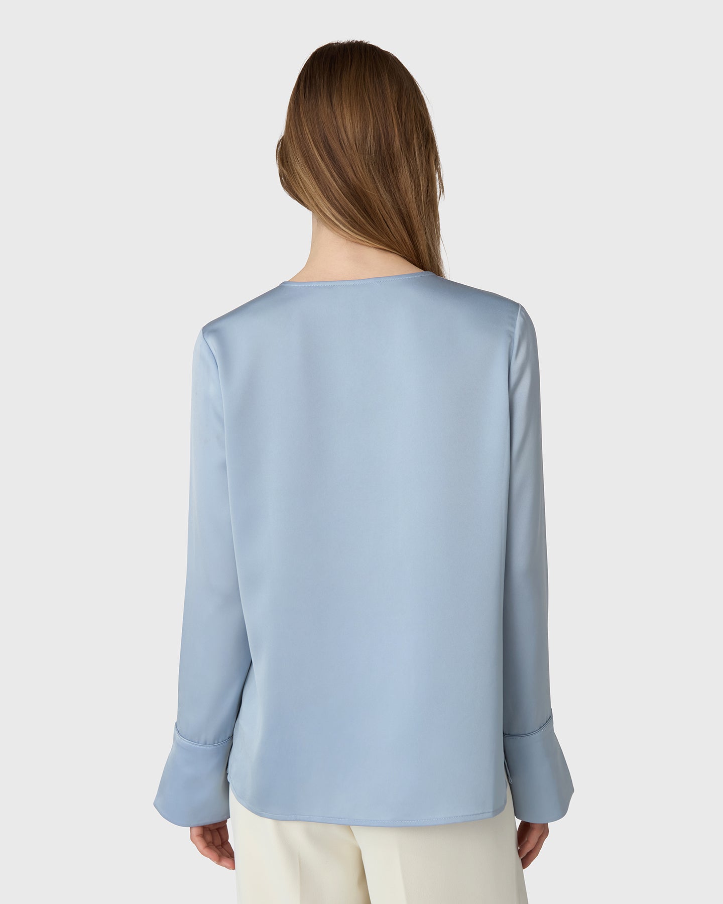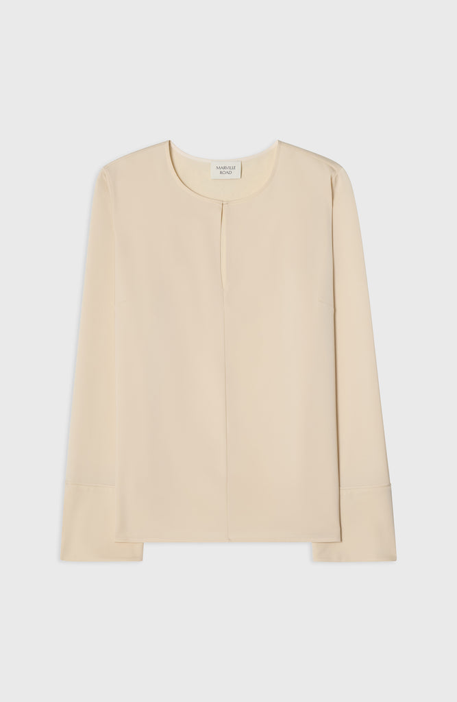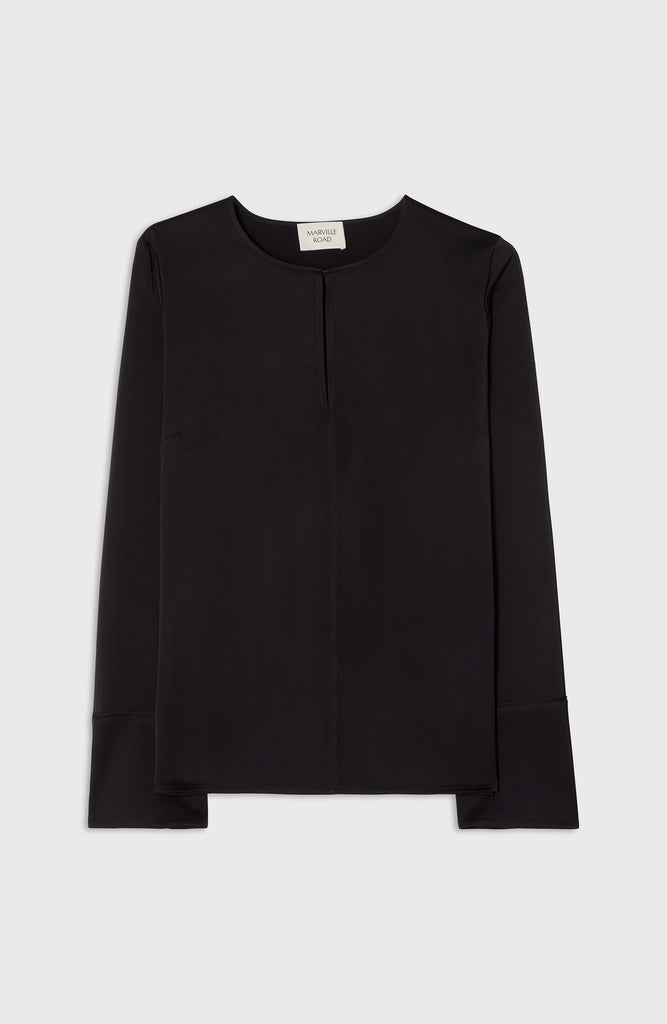 A timeless wardrobe essential with a soft twist. The Angela Blouse is cut from fluid satin stretch and features a rounded neckline with a feminine slit at the front. The subtle cuffs add a tailored finish to the relaxed silhouette, making it ideal for both professional settings and off-duty days. Tuck it into trousers or wear it loose for understated elegance.