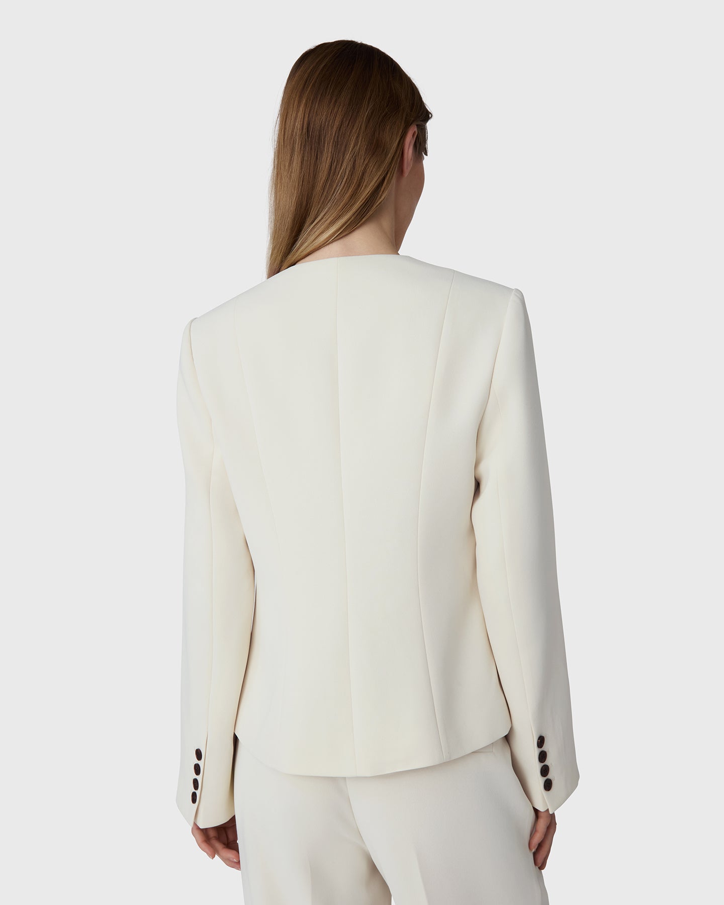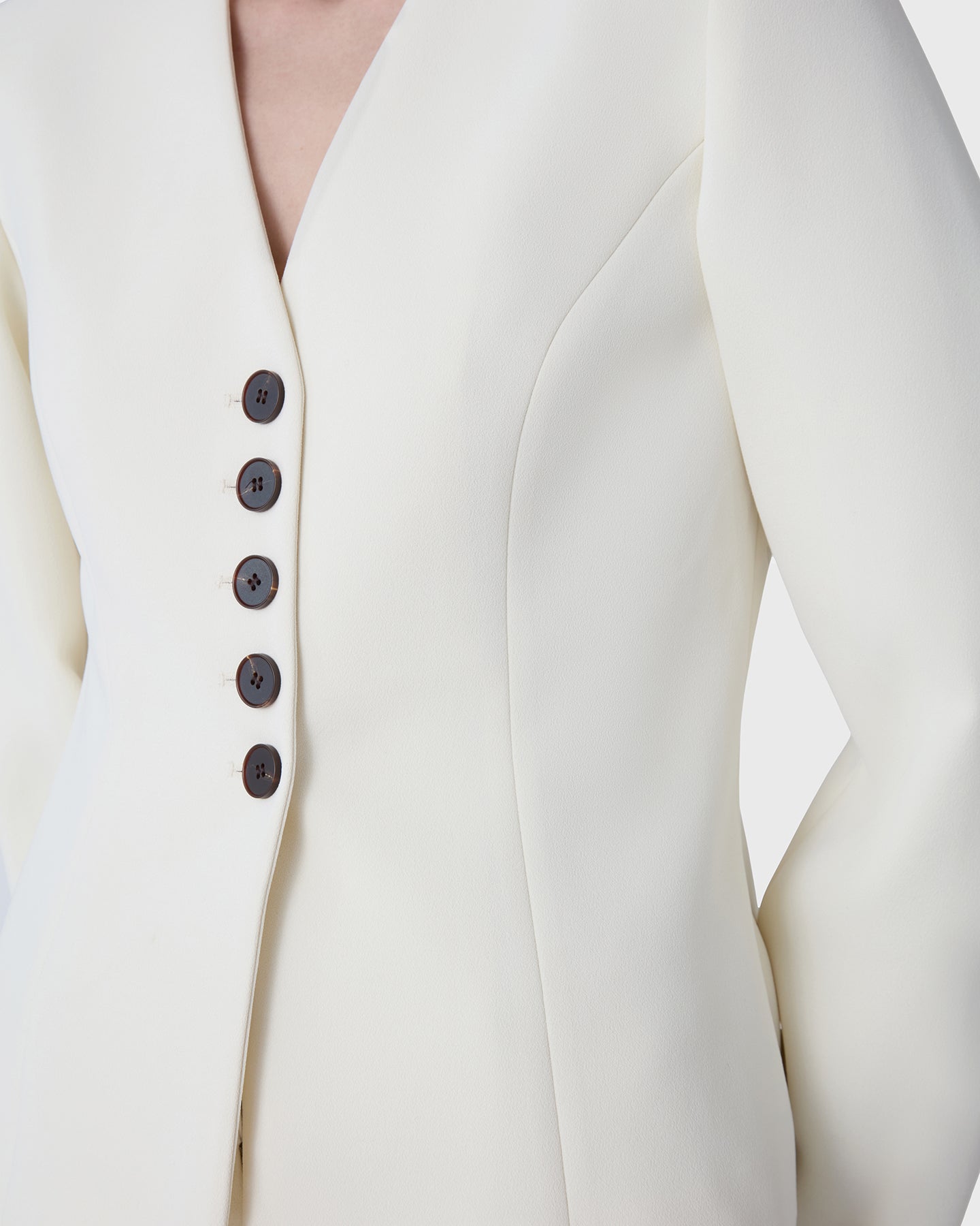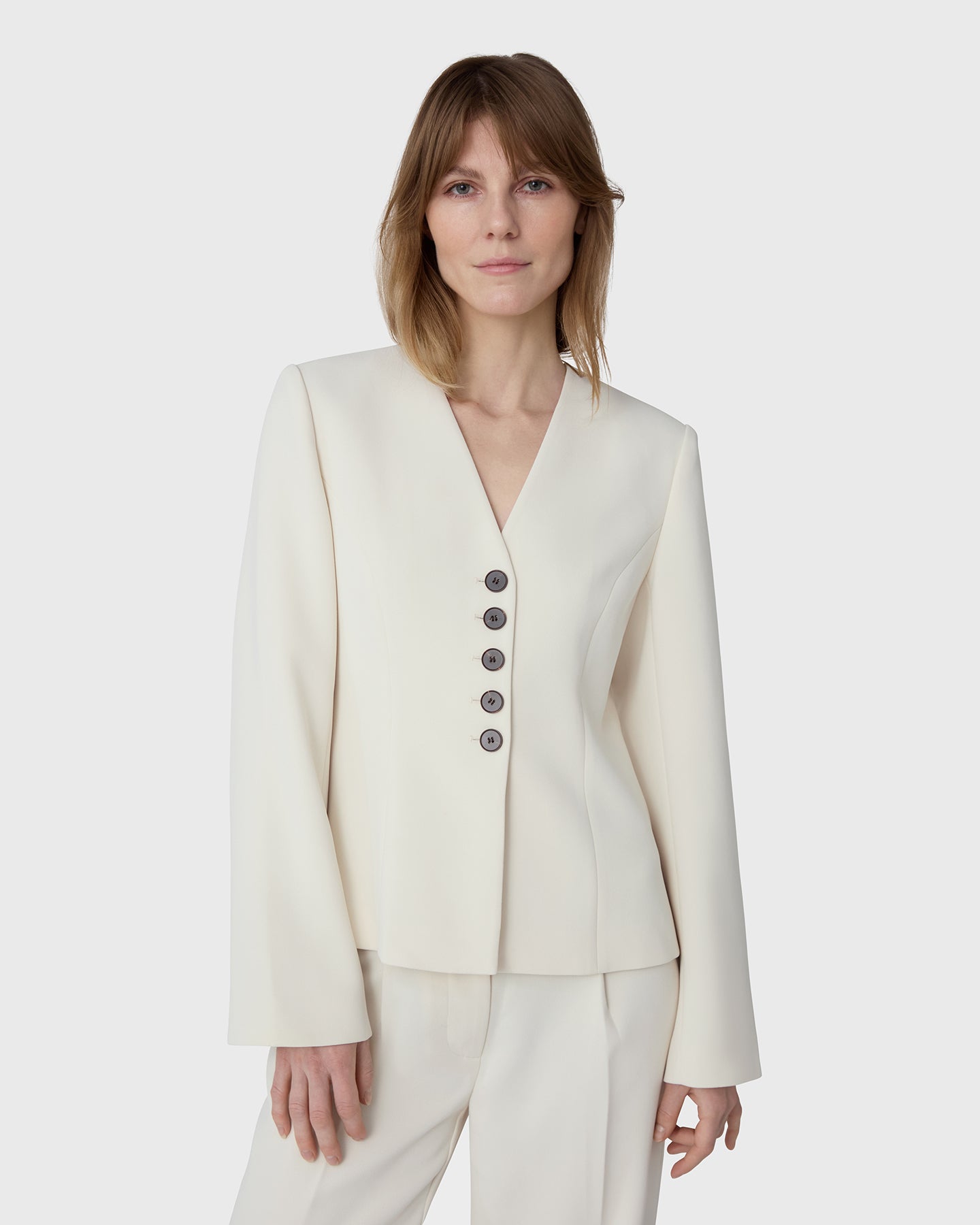 The Dania Crepe Blazer is a V-neck blazer cut in Soft Stretch Crêpe, featuring decorative buttons and a shaped waist that create a refined silhouette. Pair with tailored trousers for a more polished expression, or with denim for a relaxed feel, moving effortlessly from desk to dinner.