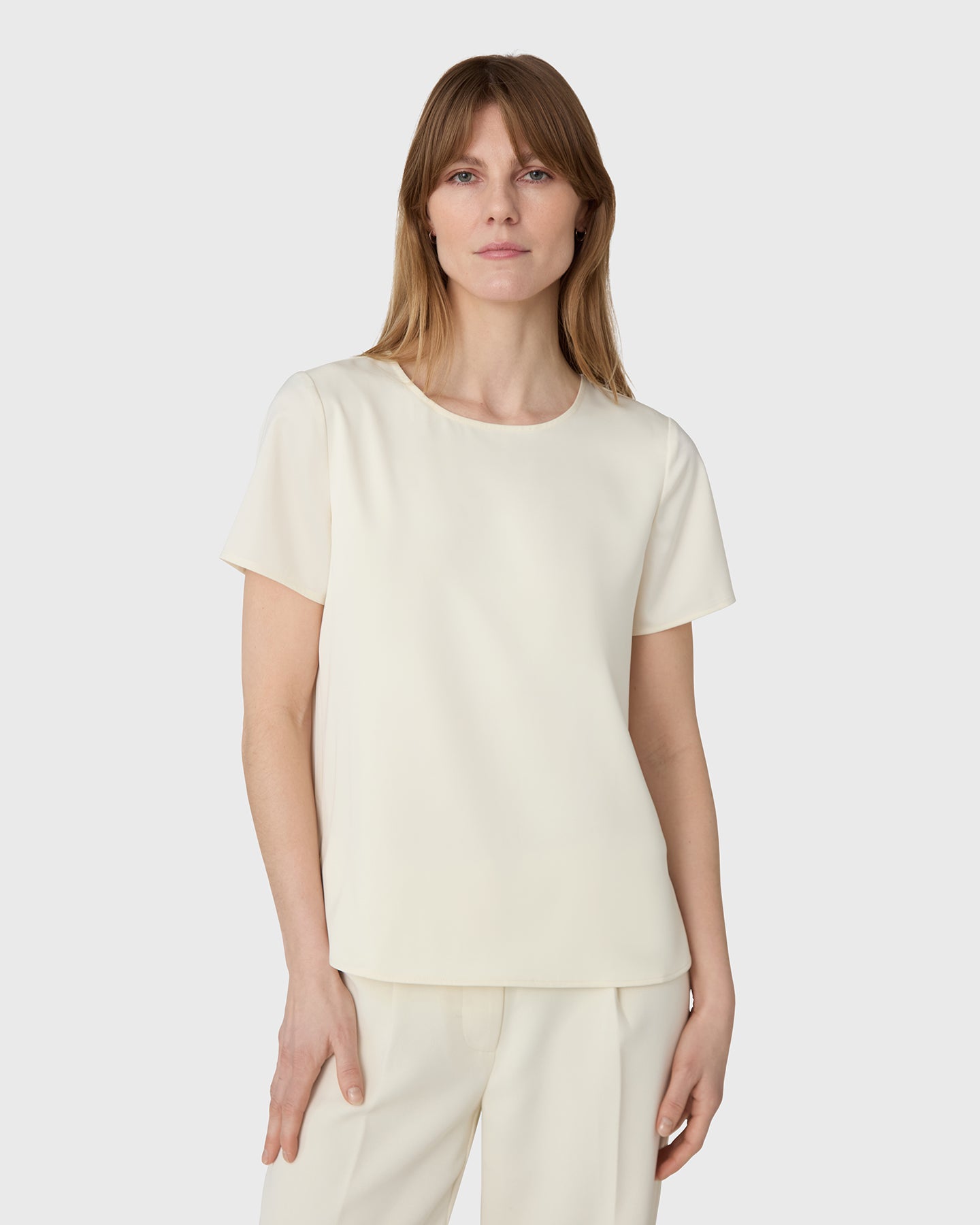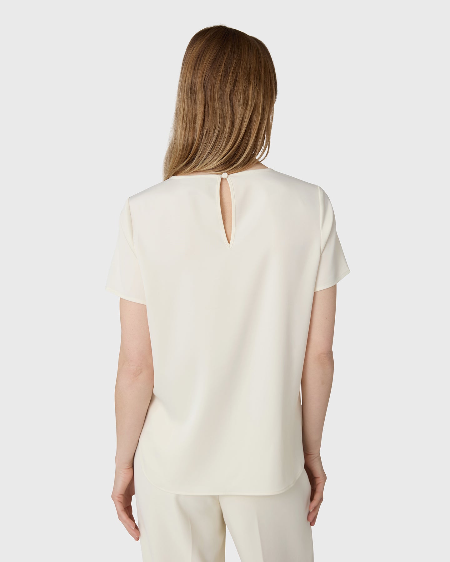 The Lorna Satin Top is a round-neck, short-sleeved top in satin stretch with a neck detail. Wear on its own or under a blazer with tailored trousers or denim.