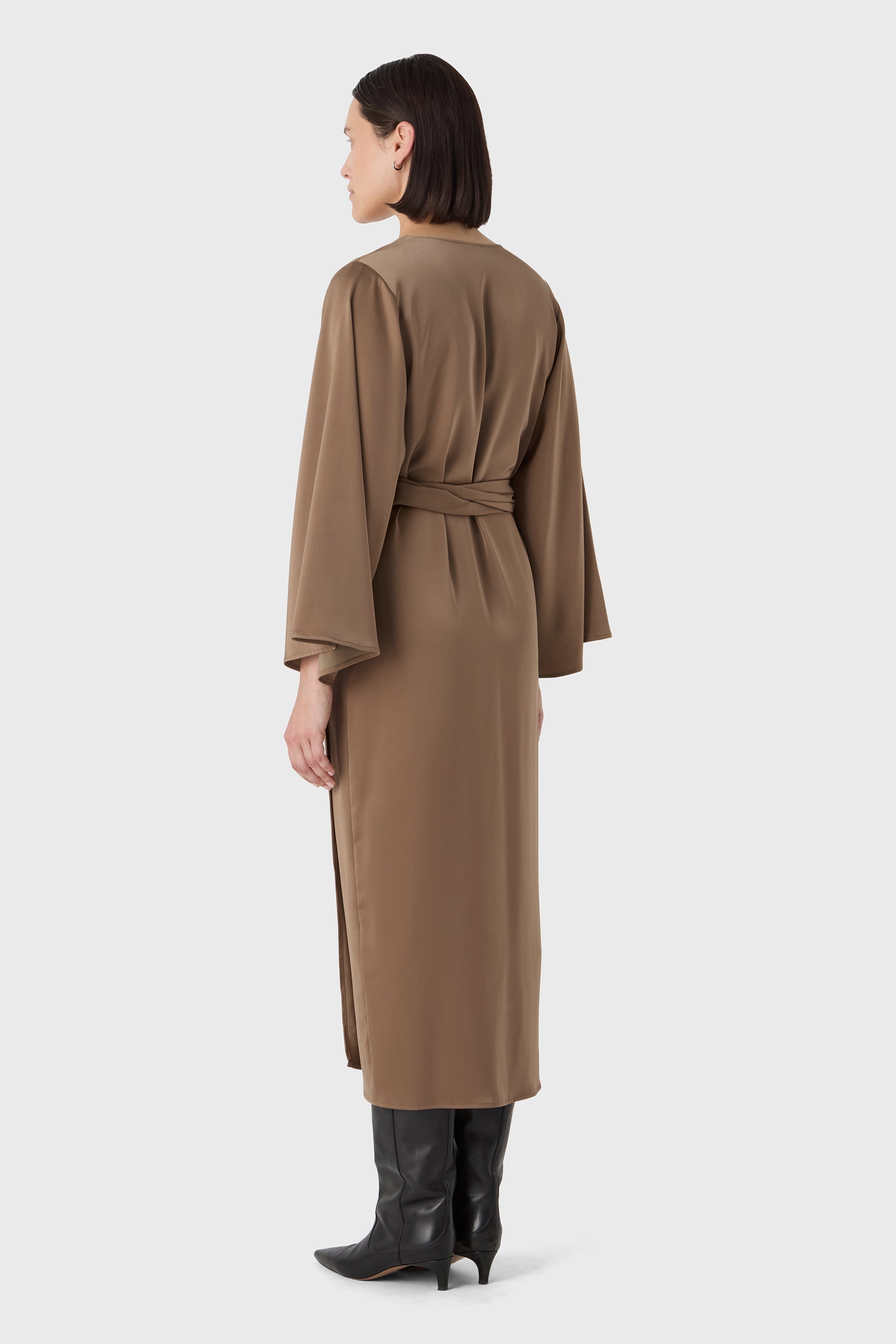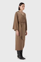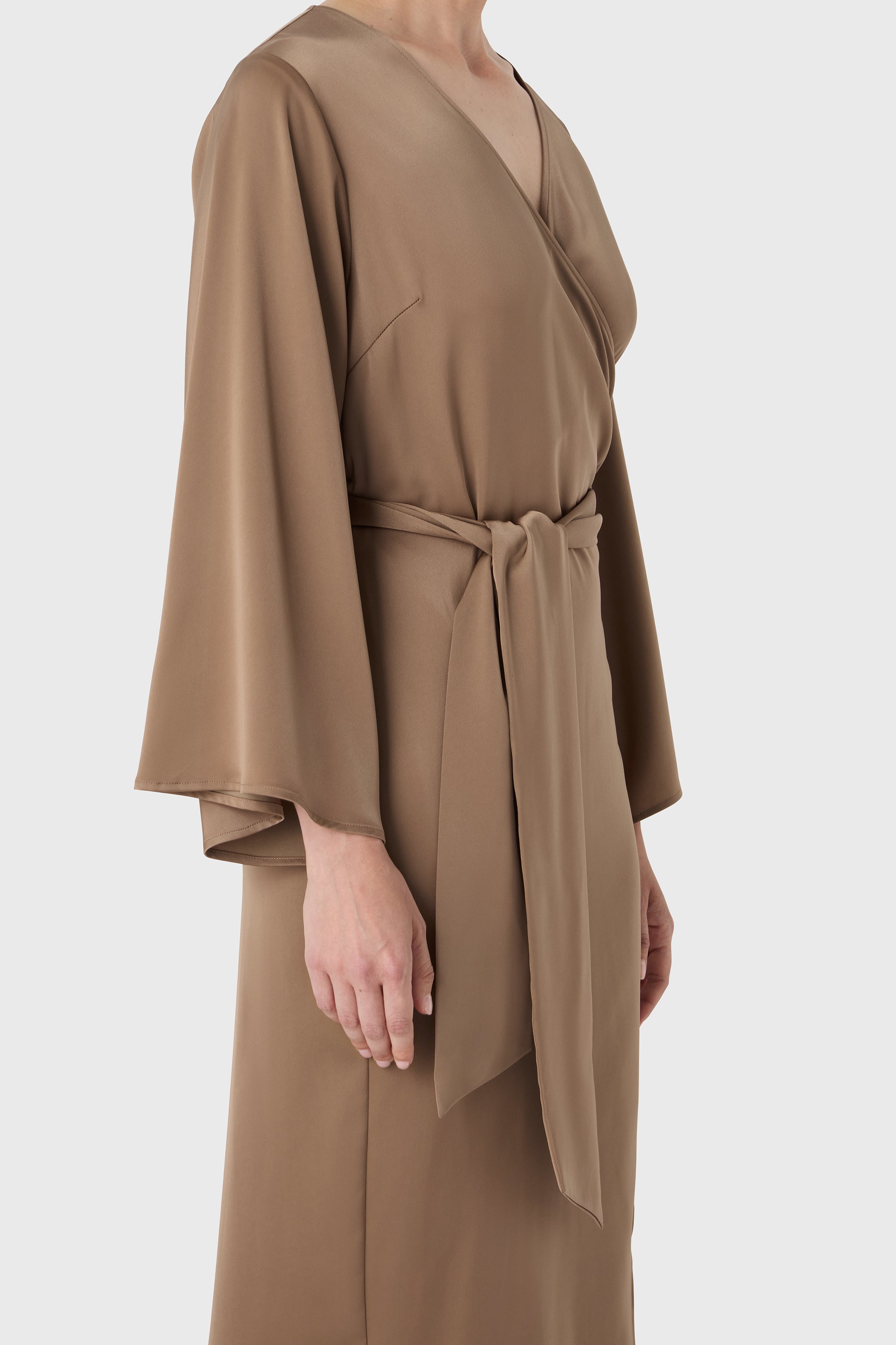 The Mira Dress is our signature wrap style – a timeless piece designed to move and breathe with you. Crafted from soft satin stretch, it drapes beautifully over the body while offering complete ease of wear. The wide sleeves and waist tie create a flattering shape that works as well for the office as it does for evening events. A go-to dress for when you need effortless elegance.