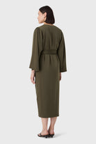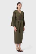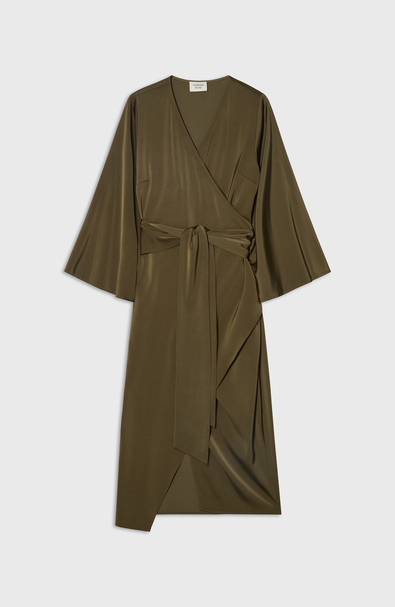 The Mira Dress is our signature wrap style – a timeless piece designed to move and breathe with you. Crafted from soft satin stretch, it drapes beautifully over the body while offering complete ease of wear. The wide sleeves and waist tie create a flattering shape that works as well for the office as it does for evening events. A go-to dress for when you need effortless elegance.