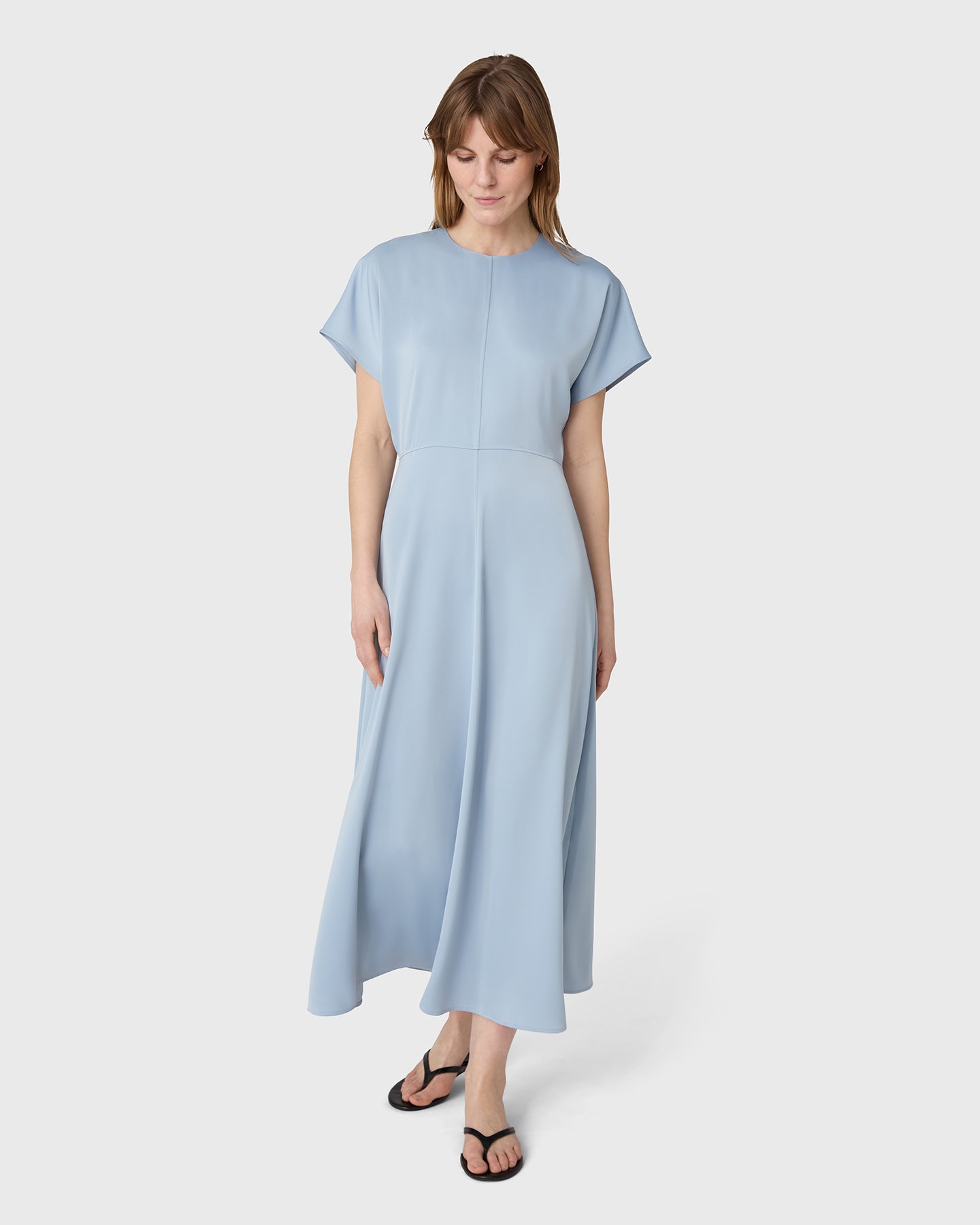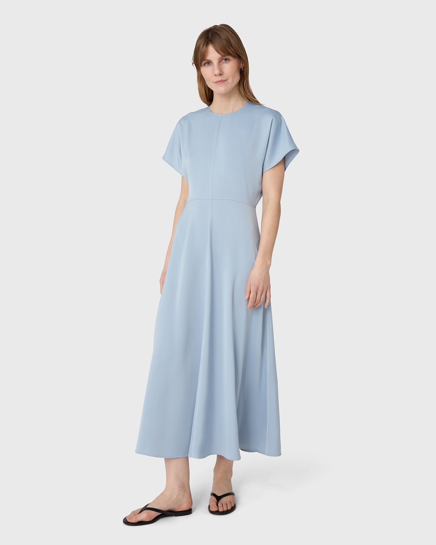 Designed to move with ease and elegance. The Rhonda Dress features a soft round neckline, short sleeves and a flowing, flared skirt. The front seams sculpt the silhouette, adding a subtle tailored feel to the fluid design. Cut in satin stretch for comfort and polish from day to night, the dress falls to ankle length.