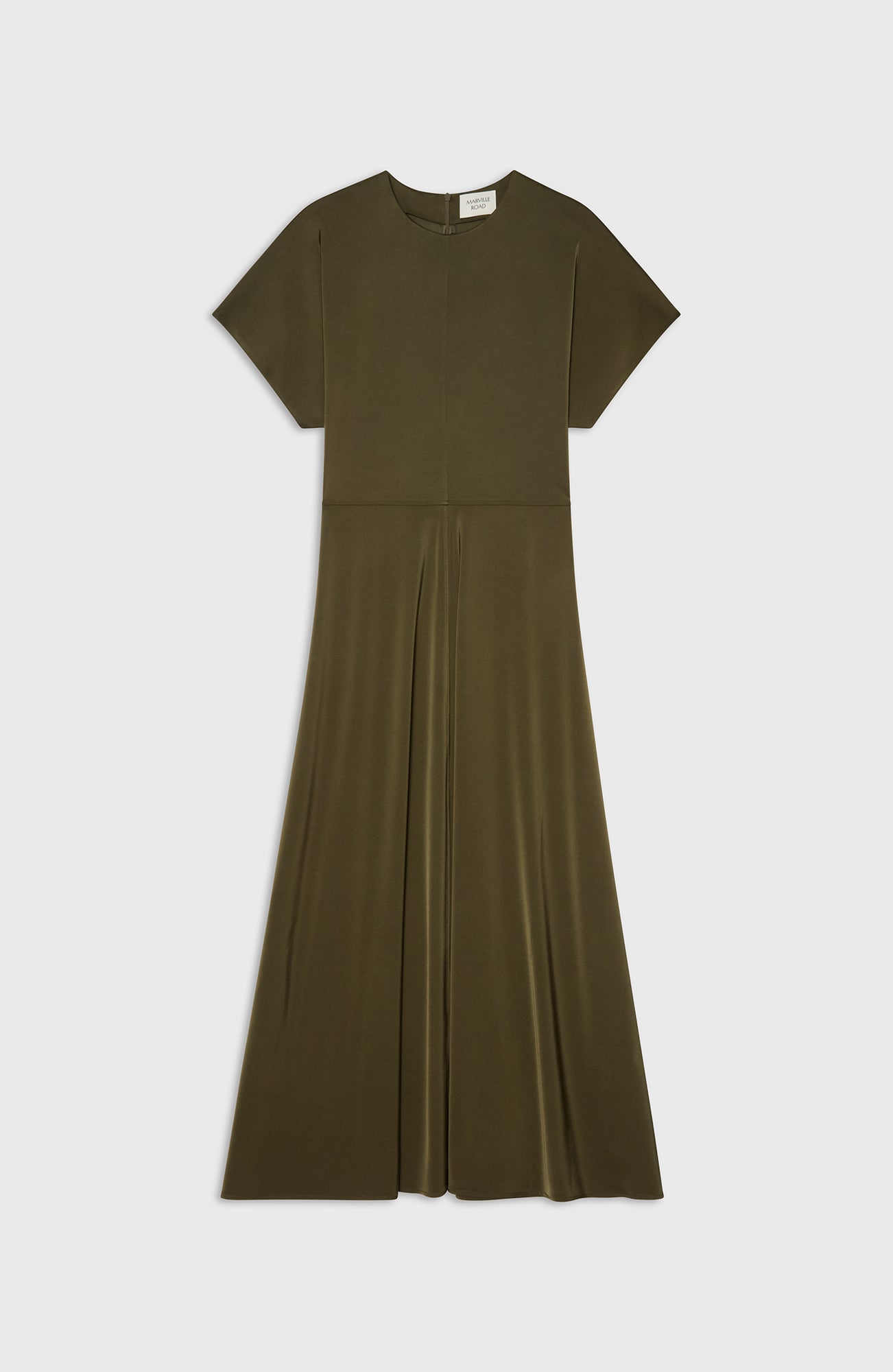 Designed to move with ease and elegance. The Rhonda Dress features a soft round neckline, short sleeves and a flowing, flared skirt. The front seams sculpt the silhouette and add a tailored feel to the otherwise fluid design. Made from satin stretch for comfort and polish from day to night. The dress falls to ankle length.